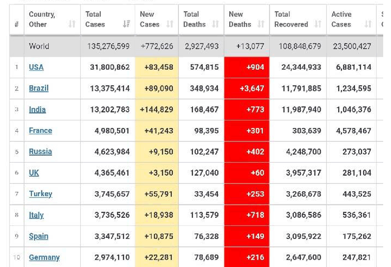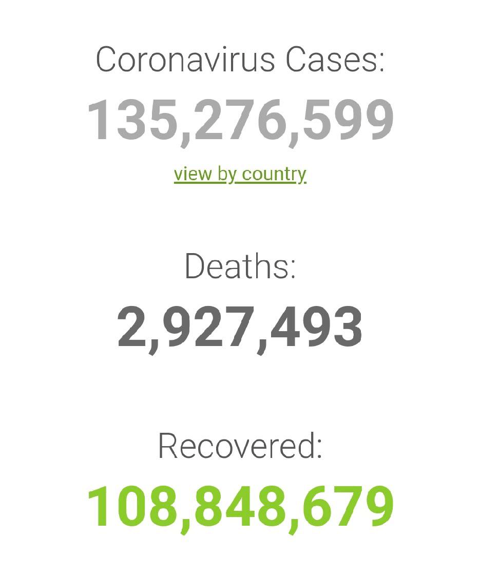 เว็บไซต์ Worldometers รายงานสถานการณ์โควิด-19 ประจำวันที่ 10 เมษายน 2564 ช่วงเวลาประมาณ 07.50 น.ตามเวลาในประเทศไทย พบผู้ติดเชื้อทั่วโลกแล้ว 135,276,599 ราย เพิ่มขึ้น 772,626 ราย เสียชีวิต 2,927,493 ราย เพิ่มขึ้น 13,077 ราย รักษาหาย 108,848,679 ราย