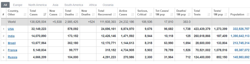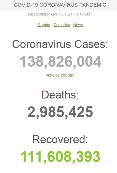เว็บไซต์ Worldometers รายงานสถานการณ์โควิด-19 ประจำวันที่ 15 เมษายน 2564 ช่วงเวลาประมาณ 09.10 น.ตามเวลาในประเทศไทย พบผู้ติดเชื้อทั่วโลกแล้ว 138,826,004 ราย เสียชีวิต 2,985,425 ราย รักษาหาย 111,608,393 ราย