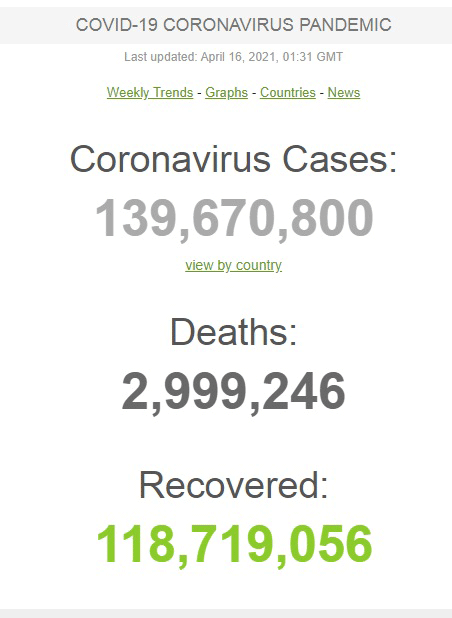 เว็บไซต์ Worldometers รายงานสถานการณ์โควิด-19 ประจำวันที่ 16 เมษายน 2564 ช่วงเวลาประมาณ 09.10 น. ตามเวลาในประเทศไทย พบผู้ติดเชื้อทั่วโลกแล้ว 139,670,800 ราย เสียชีวิต 2,999,246 ราย รักษาหาย 118,719,056 ราย