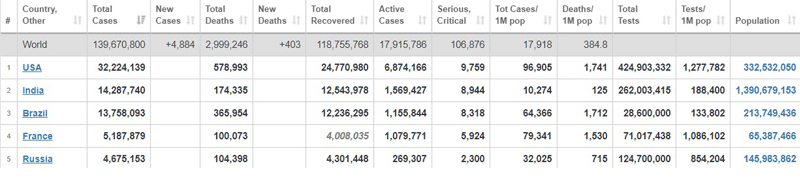 ทั่วโลกป่วยโควิดสะสมกว่า 139 ล้าน เสียชีวิต เฉียด 3 ล้านราย ขณะสหรัฐอเมริกาติดเชื้อรวม 32 ล้าน อินเดียยังวิกฤต – ไทยขยับมาที่ 111