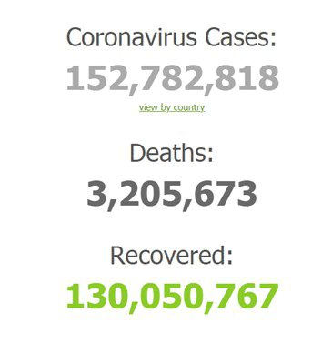 เว็บไซต์ Worldometers รายงานสถานการณ์โควิด-19 ประจำวันที่ 2 พฤษภาคม 2564 ช่วงเวลาประมาณ 06.30 น. ตามเวลาประเทศไทย พบผู้ติดเชื้อทั่วโลกแล้ว 152,782,818 ราย เพิ่มขึ้น 783,370ราย เสียชีวิต 3,205,673ราย เพิ่มขึ้น 12,439ราย รักษาหาย 130,707,188 ราย