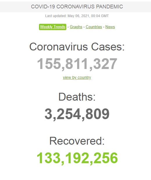 เว็บไซต์ Worldometers รายงานสถานการณ์โควิด-19 ประจำวันที่ 6 พฤษภาคม 2564 ช่วงเวลาประมาณ 07.25 น. ตามเวลาประเทศไทย พบผู้ติดเชื้อทั่วโลกแล้ว 155,811,327 ราย เพิ่มขึ้น 832,441 ราย เสียชีวิต 3,254,809 ราย เพิ่มขึ้น 14,088 ราย รักษาหาย 133,952,944 ราย