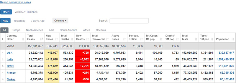 ทั่วโลกป่วยโควิด-19 เพิ่มอีก 8.3 แสนราย รวมสะสม กว่า 155 ล้าน เสียชีวิตกว่า 1.4 หมื่น – อินเดียยังหนักวันเดียวติดเชื้อ 4.1 แสนราย