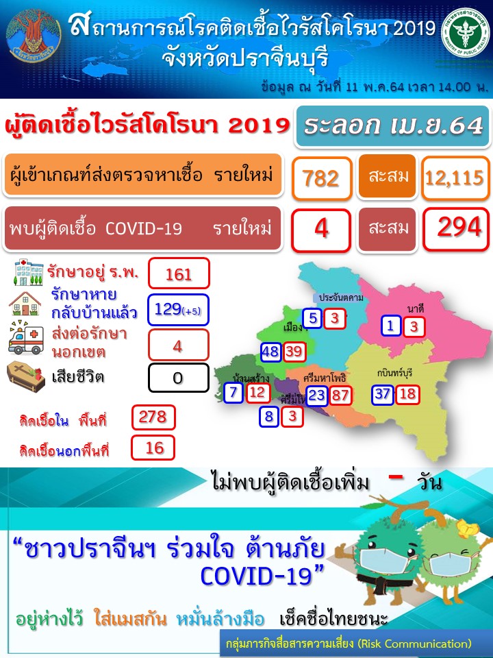 นายแพทย์โชคชัย สาครพานิช นายแพทย์สาธารณสุขจังหวัดปราจีนบุรีกรรมการ และเลขานุการคณะกรรมการโรคติดต่อจังหวัดปราจีนบุรี ได้ประกาศ จ.ปราจีนบุรีว่า “… จังหวัดปราจีนบุรีขอแจ้งสถานการณ์การแพร่ระบาดของโรคติดเชื้อไวรัสโคโรนา 2019 ณ วันที่ 11 พฤษภาคม 2564 พบผู้ติดเชื้อไวรัสโคโรนา 2019 รายใหม่ จำนวน 4 ราย เป็นผู้ป่วย สะสมในพื้นที่ 278 ราย นอกพื้นที่เข้ามารักษา 16 ราย ทำให้จังหวัดปราจีนบุรี มีผู้ป่วยสะสม (ระลอกเมษายน 2554) ตั้งแต่วันที่ 30 เมษายนถึง 17 พฤษภาคม 2554 จำนวน 294 ราย ได้เข้ารับการรักษาในโรงพยาบาลทุกราย ผู้สัมผัสใกล้ชิดเสี่ยงสูงได้ติดตามตรวจหาเชื้อแล้ว