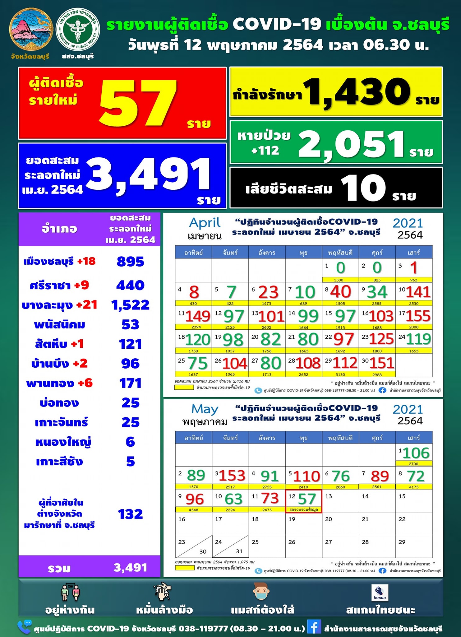 วันที่ 12 พฤษภาคม 2564 สำนักงานสาธารณสุขจังหวัดชลบุรี (สสจ.) ชลบุรี รายงานพบผู้ติดเชื้อโควิด-19 รายใหม่ เพิ่มอีกจำนวน 57 ราย ค้นหาผู้สัมผัสเสี่ยงกว่า 300 ราย ตรวจเชิงรุกเบื้องต้น 485 ราย สำหรับรายละเอียดผู้ติดเชื้อโควิด-19 รายใหม่ มีดังนี้