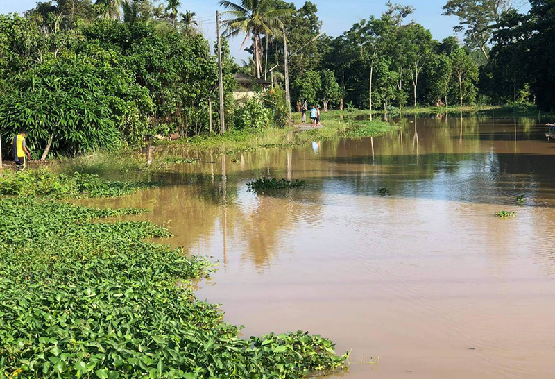 ล่าสุดเมื่อช่วงเช้าที่ผ่านมาผู้สื่อข่าวได้ลงสำรวจพื้นที่ซึ่งเป็นเส้นทางน้ำไหลผ่านพบว่าขณะนี้น้ำได้เอ่อล้นตลิ่งเข้าท่วมในชุมชนบ้านทุ่ง เขตเทศบาลเมืองสะเดา ถนนทางเข้าหมู่บ้านถูกน้ำท่วมระดับน้ำสูง10-20 เซนติเมตร รถยังเข้าออกได้ รวมทั้งยังท่วมสวนยางพารา และมีบ้านเรือนของชาวบ้านหลายหลังที่เสี่ยงน้ำไหลเข้าบ้าน ชาวบ้านต้องขนย้ายสิ่งของไว้ที่สูงโดยเฉพาะรถยนต์และรถจักรยานยนต์