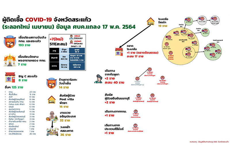 นพ.ประภาส ผูกดวง นายแพทย์สาธารณสุขจังหวัดสระแก้ว เปิดเผยว่า วันนี้ผู้ติดเชื้อรายใหม่ 5 ราย (ติดเชื้อจากในจังหวัด 1 ราย ติดเชื้อจากจังหวัดอื่น 4 ราย) และติดเชื้อจากต่างประเทศ 2 ราย รวมทั้งสิ้น 7 ราย มาจากการคัดกรองเชิงรุกและกลุ่มเสี่ยงสูงที่สัมผัสกับผู้ป่วยยืนยัน เป็นเพศชาย 3 ราย หญิง 4 ราย อายุระหว่าง 17 – 60 ปี ในวันนี้มีผู้สัมผัสเสี่ยงสูง 14 ราย ทำให้การระบาดระลอกใหม่เมษายน 2564 ตั้งแต่วันที่ 4 เมษายน-16 พฤษภาคม 2564 จังหวัดสระแก้วมีผู้ป่วยสะสมทั้งสิ้น 477 ราย ติดเชื้อจากต่างประเทศ 34 ราย เข้ารักษาตัวอยู่ในสถานพยาบาลของรัฐ เอกชน และโรงพยาบาลสนามรวมทั้งสิ้น 157 ราย รักษาหายแล้ว 351 ราย