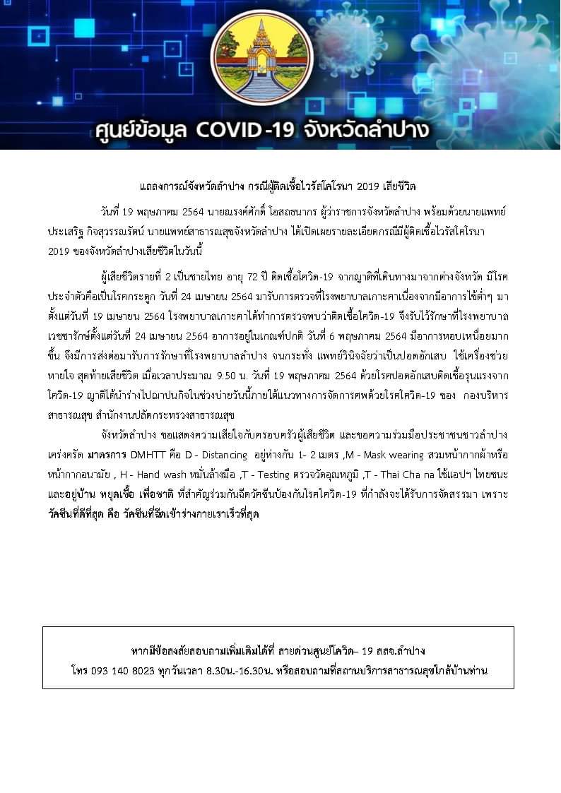 จังหวัดลำปาง ขอแสดงความเสียใจกับครอบครัวผู้เสียชีวิต และขอความร่วมมือประชาชนชาวลำปางเคร่งครัด มาตรการ DMHTT คือ D – Distancing อยู่ห่างกัน 1- 2 เมตร ,M – Mask wearing สวมหน้ากากผ้าหรือหน้ากากอนามัย , H – Hand wash หมั่นล้างมือ T – Testing ตรวจวัดอุณหภูมิ T – Thai Cha กa ใช้แอปฯ ไทยชนะและอยู่บ้าน หยุดชื้อ เพื่อชาติ ที่สำคัญร่วมกันฉีดวัคซีนป้องกันโรคโควิด-19 ที่กำลังจะไต้รับการจัดสรรมา เพราะวัคซีนทีดีที่สุด คือ วัคซีนทีฉีดเข้าร่างกายเราเร็วที่สุด