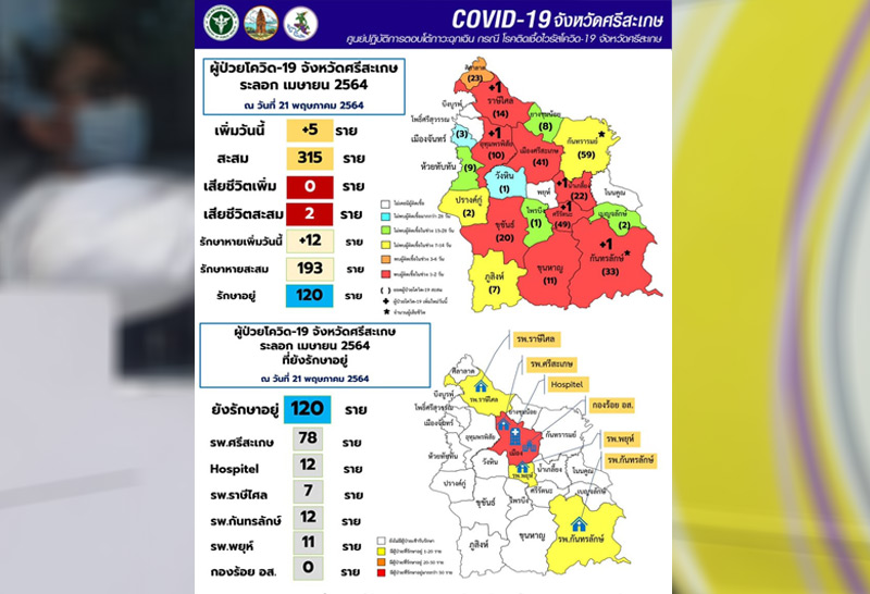 ศรีสะเกษ พบผู้ติดเชื้อโควิด-19 ณ วันที่ 21 พ.ค. 64 เพิ่มขึ้น 5 ราย ผู้ป่วยสะสม 315 ราย รักษาหายแล้ว 193 ราย เสียชีวิตสะสม 2 รายยังคงรักษาอยู่ 120 ราย ในโรงพยาบาลต่างๆดังนี้