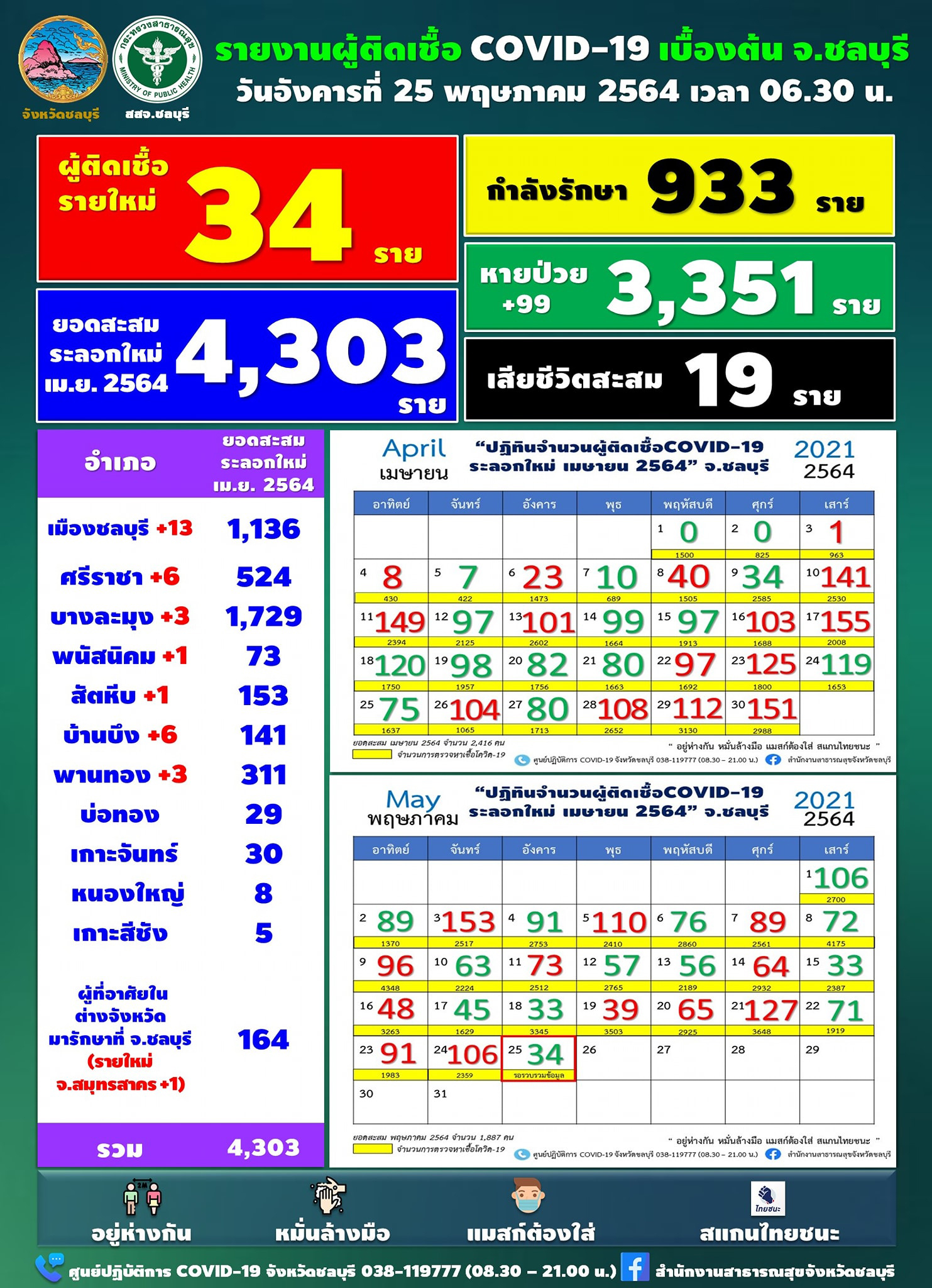 วันที่ 25 พฤษภาคม 2564 สำนักงานสาธารณสุขจังหวัดชลบุรี (สสจ.) ชลบุรี รายงานพบผู้ติดเชื้อโควิด-19 รายใหม่ เพิ่มอีกจำนวน 34 ราย รวมยอดสะสม 4,303 ราย มี อ.บางละมุง ยอดสะสมเยอะมากที่สุด 1,729 ราย รองลงมาคือ อ.เมืองชลบุรี 1,136 ราย