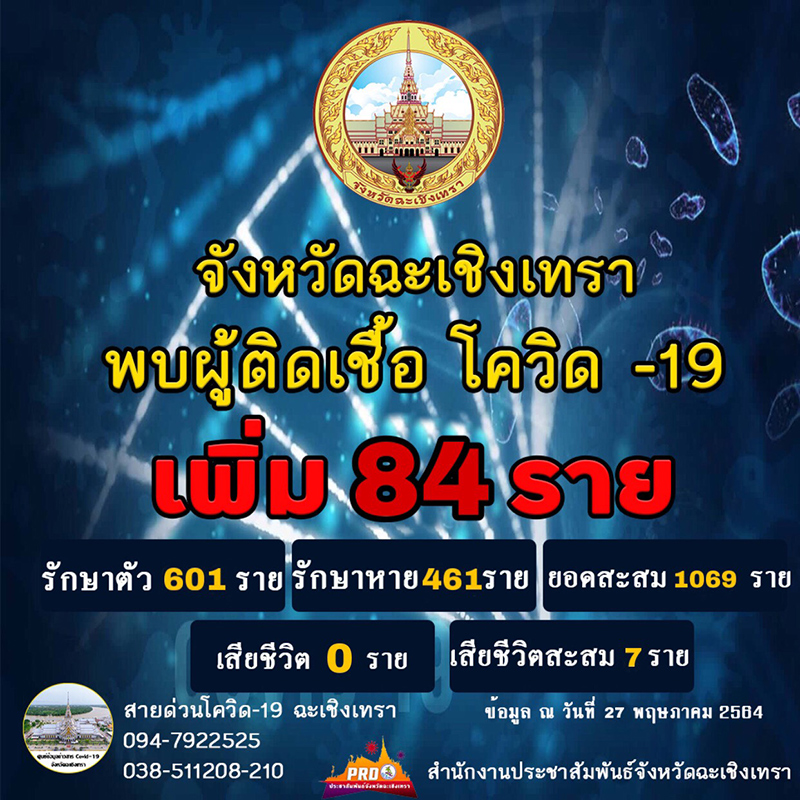 สถานการณ์การระบาดของโรคโควิด-19 ในพื้นที่ จ.ฉะเชิงเทรา ในวันนี้ยังคงมีการระบาดอย่างรุนแรงแบบต่อเนื่องในพื้นที่ โดยมีผู้ติดเชื้อรายวันเพิ่มสูงขึ้นมากถึง 84 ราย โดยเป็นการระบาดแบบกลุ่มใหญ่ภายในเรือนจำกลางฉะเชิงเทรา ที่มีผู้ป่วยเพิ่มขึ้นในวันเดียวมากถึง 71 ราย จึงทำให้มีผู้ป่วยภายในสะสมสูงถึง 345 ราย จากผู้ต้องขังทั้งหมด 2,691 คน หรือคิดเป็นร้อยละ 12.82 จากจำนวนผู้ต้องขังทั้งหมด