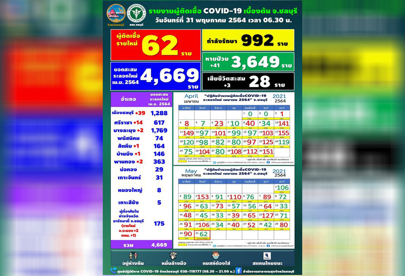 ชลบุรีพบผู้ติดเชื้อโควิด-19 รายใหม่ จำนวน 62 ราย