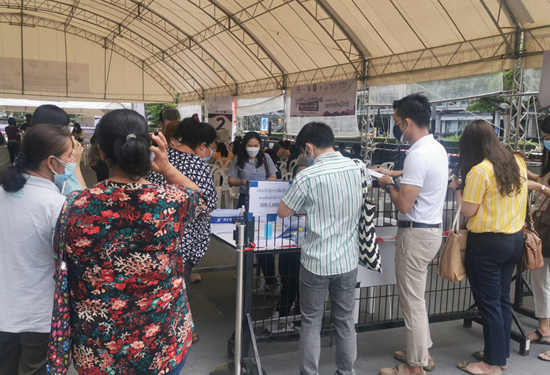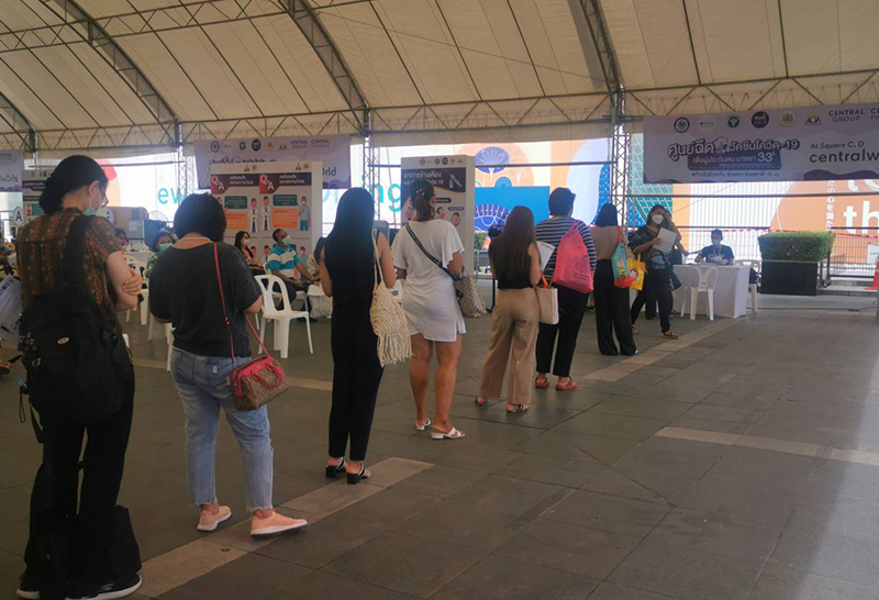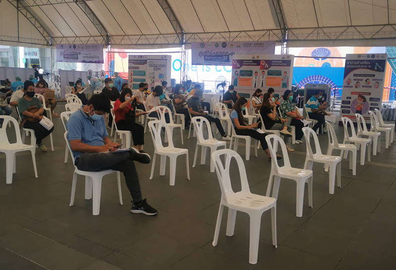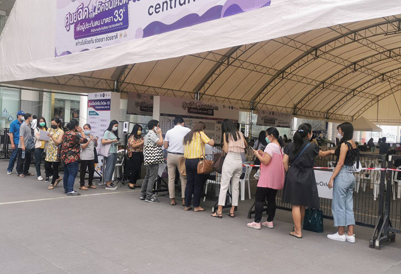 ผู้ประกันตน ตาม ม.33 เข้าคิว ทยอยฉีดวัคซีน จุดบริการนอกสถานพยาบาล หน้าเซ็นทรัลเวิลด์