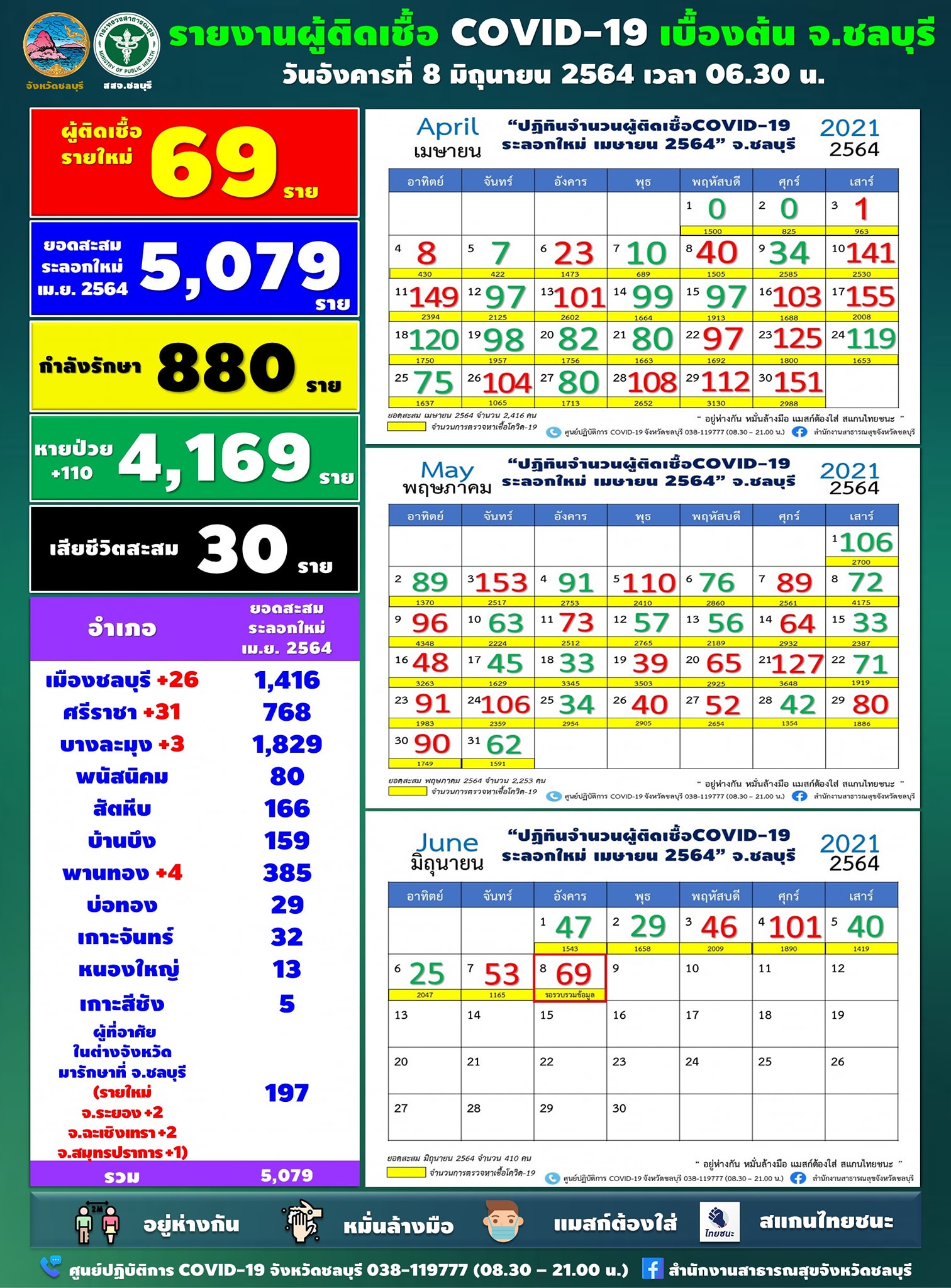 วันที่ 8 มิถุนายน 2564 สำนักงานสาธารณสุข จังหวัดชลบุรี (สสจ.) ชลบุรี รายงานพบผู้ติดเชื้อโควิด-19 รายใหม่ เพิ่มอีกจำนวน 69 ราย รวมยอดสะสม 5,079 ราย มี อ.บางละมุง ยอดสะสมเยอะมากที่สุด 1,829 ราย รองลงมาคือ อ.เมืองชลบุรี 1,416 ราย