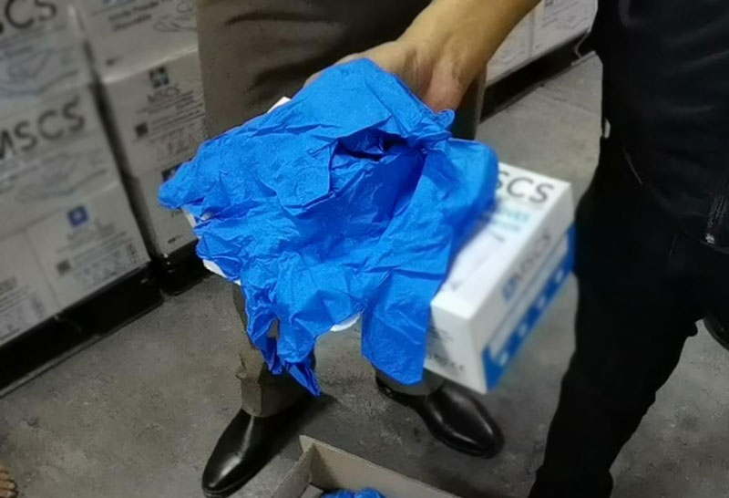 จากการเข้าตรวจสอบพบได้ประสานเจ้าของสถานที่ให้นำเข้าตรวจสอบ พบนายวิชาญวิทย์ อายุ 26 ปี คนดูแล เมื่อตรวจสอบข้อมูลการอนุญาต ไม่พบว่าโกดังดังกล่าวไม่ได้รับการขึ้นทะเบียนเป็นสถานประกอบการ ตาม พ.ร.บ.เครื่องมือแพทย์ พ.ศ.2551 และจากการตรวจสอบภายในโกดังไม่พบเจ้าหน้าที่ หรือพนักงานทำงานอยู่ภายในตัวอาคาร พบเพียงแต่ของกลางหลายรายการ อาทิ ถุงมือยางที่บรรจุแล้วจำนวนกว่า 1,000 กล่อง และกล่องบรรจุที่เตรียมบรรจุอีกเป็นจำนวนมาก ทางเจ้าหน้าที่จึงได้ทำการอายัดไว้ตรวจสอบตามขั้นตอนของ สสจ.ชลบุรี ต่อไป
