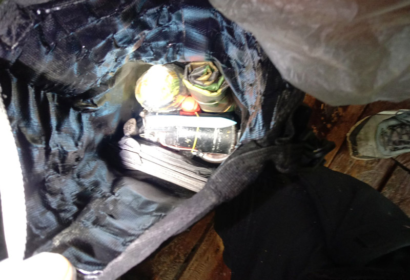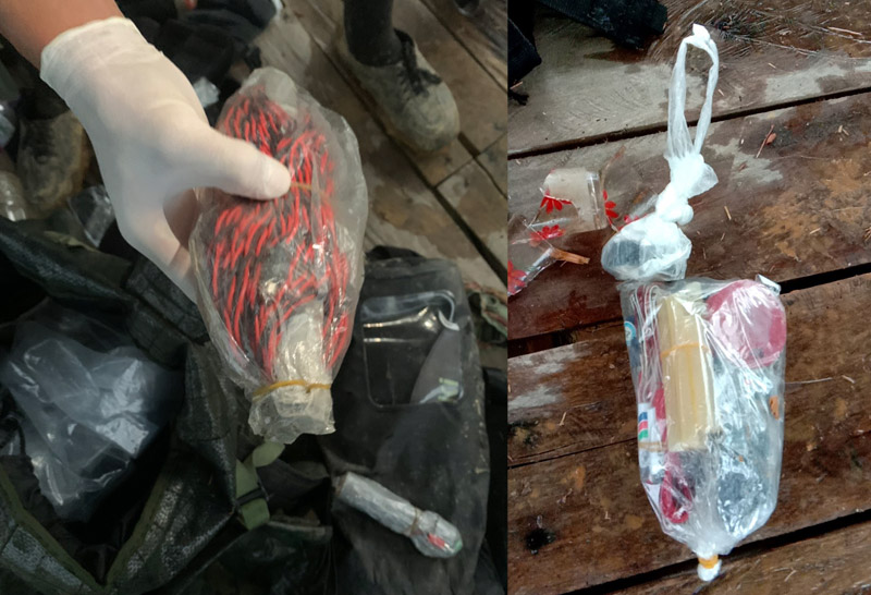 และจากการเข้าตรวจสอบพื้นที่จุดเกิดเหตุบริเวณขนำดังกล่าว เจ้าหน้าที่ตรวจพบอุปกรณ์จำนวนหลายรายการ ได้แก่ 1.เป้สนาม จำนวน 3 ใบ 2.โทรศัพท์มือถือ จำนวน 4 เครื่อง 3.ลูกระเบิดแสวงเครื่อง ชนิดไปป์บอมบ์ จำนวน 6 ลูก 4.เสื้อใส่ซองกระสุน 2 ตัว6.ซองกระสุน พร้อมกระสุน ขนาด 7.62 จำนวน 2 ซอง 7.ซองกระสุน พร้อมกระสุน ขนาด 5.56 จำนวน 2 ซอง M,HK 8.บัตรประจำตัวประชาชน ของนายกอเซ็ง บารอวา อยู่ ม.5 ต.สามัคคี อ.รือเสาะ จ.นราธิวาส ซึ่งเป็นผู้ต้องหาตามหมายจับ ป.วิอาญา จำนวน 4 หมาย เจ้าหน้าที่จึงได้ตรวจยึดของกลางทั้งหมด