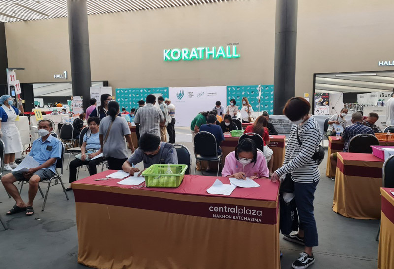 ผู้สื่อข่าวรายงานบรรยากาศการฉีดวัคซีนต้านไวรัสโควิด-19 ในพื้นที่จังหวัดนครราชสีมา ยังคงมีประชาชนให้ความสนใจเดินทางมาฉีดวัคซีนตามจุดบริการต่างๆ ทั้งในพื้นที่ต่างอำเภอและในตัวเมืองนครราชสีมาเป็นจำนวนมาก โดยเฉพาะที่ห้องโคราช Hall ชั้น 4 ศูนย์การค้าเซ็นทรัลพลาซ่านครราชสีมา ซึ่งเป็นจุดฉีดวัคซีนในความรับผิดชอบของโรงพยาบาลมหาราชนครราชสีมา ได้มีประชาชนเดินทางมาต่อคิวเพื่อรับการฉีดวัคซีน ต้านไวรัสโควิด-19 กันอย่างคึกคัก สำหรับการฉีดวัคซีนที่ศูนย์การค้าเซ็นทรัลฯ ในวันนี้ จะเป็นการฉีดวัคซีนซิโนแวคให้กับประชาชนทั่วไป ที่ลงทะเบียนจองคิวในแอปพลิเคชั่น “มหาราชพร้อม” ไว้วันที่ 10 มิถุนายน 2564 และเก็บตกผู้ที่จองคิวไว้ เมื่อวันที่ 7 มิถุนายน 2564 รวมจำนวนกว่า 3,000 คน ซึ่งบรรยากาศที่จุดนี้ มีประชาชนให้ความตื่นตัวเดินทางมาต่อคิว รับการฉีดวัคซีนเป็นจำนวนมากตั้งแต่เช้า โดยเฉพาะผู้ที่มีอายุ 60 ปีขึ้นไป หลายคนมากับลูกหลาน และมีความมั่นใจในความปลอดภัย ไม่กลัวต่อขาวผลข้างเคียง