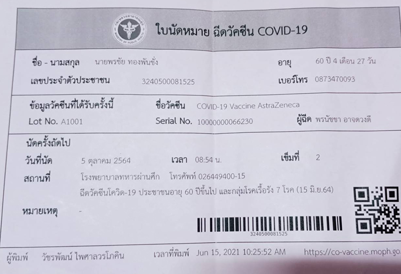 จากการสอบถามนางวิภา ทองพันชั่ง อายุ 56 ปี ภรรยานายพรชัย ทองพันชั่ง อายุ 60 ปี สามีได้ลงทะเบียนหมอพร้อมเพื่อฉีดวัคซีนแอสตราเซเนกาป้องกันโควิด-19 ที่โรงพยาบาลทหารผ่านศึกซึ่งหมอนัดประมาณ 10.00 น. แต่สามีไปถึงก่อนเวลาจึงได้เข้าฉีดวัคซีนก่อนแต่ก็ไม่มีอาการอะไรและนั่งดูอาการประมาณ 30 นาที จึงกลับมาที่บ้าน พอมาถึงบ้านสามีหิวน้ำและกินน้ำเยอะมากกว่าปกติและเวลาประมาณ 20.00 น. สามีมีอาการแน่นท้องเพราะกินน้ำเยอะ สามีจึงบอกให้ตนเอาน้ำร้อนใส่ถุงร้อนแล้วก็นำมาพันที่เอว จากนั้นตนก็เดินออกไปนั่งที่หน้าห้องและตนก็ได้ยินเสียงเหมือนไอหรือหายใจแรงๆตนจึงเดินเข้ามาดูเห็นเขานอนนิ่งตนจึงไปปลุกเรียกแต่สามีก็ไม่ตื่นและตนก็ปั้มหัวใจไปด้วยจากนั้นตนก็ได้เรียกให้เพื่อนบ้านเข้ามาช่วยเหลือแต่เรียกรถกู้ภัยเข้ามาช่วยแต่ก็ไม่ทันการเพราะสามีได้เสียชีวิตไปแล้ว ก่อนหน้าที่จะไปฉีดวัคซีนสามีมีสุขภาพร่างกายแข็งแรงไม่มีโรคประจำตัวอะไรเลย สาเหตุการเสียชีวิตตนเองก็ไม่แน่ใจเพราะสามีไม่มีโรคประจำตัวแต่พอไปฉีดวัคซีนมาสามีก็เสียชีวิต วัคซีนที่สามีฉีดนั้นเป็นยี่ห้อ แอสตราเซเนกา สำหรับผู้ที่สูงอายุและกลุ่มมีโรคประจำตัวซึ่งแพทย์ระบุสาเหตุการเสียชีวิตคือโรคหลอดเลือดหัวใจตีบ ส่วนกำหนดการบำเพ็ญกุศลสวดอภิธรรมเป็นเวลา 3 คืน และจะฌาปนกิจศพวันที่ 19 มิ.ย.64 ส่วนเรื่องเอกสารต่างๆต้องรอให้ครบก่อน ส่วนตัวเองไปฉีดวัคซีนแอสตราเซนเนกา แล้วเมื่อวันที่ 9 มิ.ย.64 ที่มหาวิทยาลัยเกษตรศาสตร์ แต่เข็มที่ 2 ยังไม่กำหนดวันฉีดวัคซีนซึ่งตนเองก็ต้องมาคิดดูก่อนว่าจะฉีดเข็มที่ 2 ดีหรือไม่