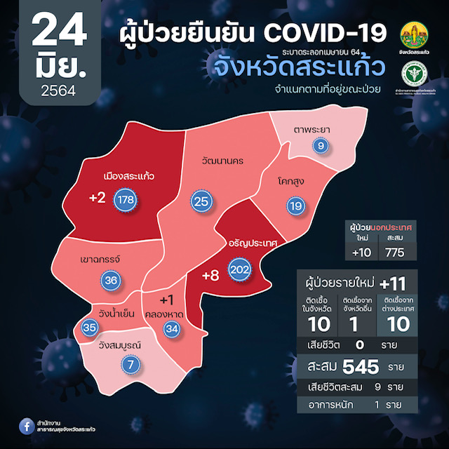 นพ.ประภาส ผูกดวง นายแพทย์สาธารณสุขจังหวัดสระแก้ว เปิดเผยว่า วันนี้พบผู้ป่วยรายใหม่ติดเชื้อ 11 ราย เป็นการติดเชื้อในจังหวัด 11 รายที่อำเภออรัญประเทศ 8 ราย อำเภอเมืองสระแก้ว 2 ราย อำเภอคลองหาด 1 ราย และติดเชื้อจากต่างประเทศ 10 ราย รวมทั้งสิ้น 21 รายสะสม 1,320 ราย แยกเป็นติดเชื้อในจังหวัดและติดเชื้อจากจังหวัดอื่น 545 ราย และติดเชื้อจากต่างประเทศ 775 ราย กำลังรักษาตัว 207 ราย รักษาหายแล้ว 1,104 ราย เสียชีวิตสะสม 9 ราย