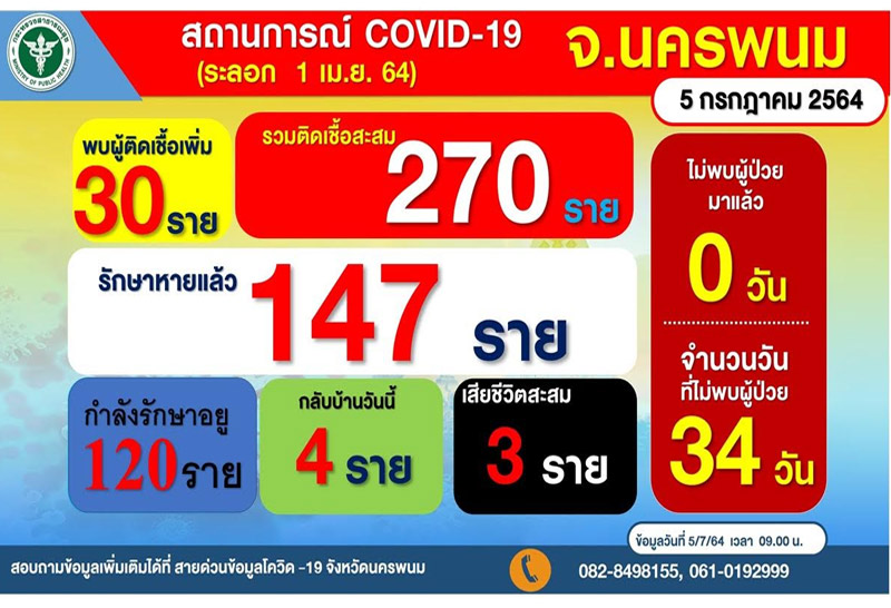 นายไกรสร กองฉลาด ผู้ว่าราชการจังหวัดนครพนม และนายแพทย์มานพ ฉลาดธัญญกิจ นายแพทย์สาธารณสุขจังหวัดนครพนม ร่วมกันแถลงสถานการณ์การแพร่ระบาดของไวรัสโควิด–19 ในพื้นที่ ซึ่งวันนี้มีผู้ป่วยยืนยันเพิ่ม 30 ราย (รายที่ 240-270) เป็นผู้ที่มาจากพื้นที่เสี่ยงทั้งหมด โดยทุกคนได้มีการปฏิบัติตามมาตรการของจังหวัดอย่างเคร่งครัด คือเมื่อมาถึงได้เข้ารายงานตัว และทำการตรวจหาเชื้อเมื่อพบก็เข้าสู่กระบวนการรักษายังไม่มีใครเข้าสู่ชุมชนแต่อย่างใด ขณะเดียวกันในวันนี้ก็มีผู้เสียชีวิต 1 ราย เป็นรายที่ 152 ของจังหวัด เพศชาย อายุ 61 ปี เดิมรักษาที่ รพ.ปลาปาก แต่ด้วยมีโรคประจำตัวที่มีความสุ่มเสี่ยงต่อการเกิดอาการรุนแรงและเสียชีวิต เนื่องจากเป็นคนอ้วนน้ำหนัก 103 กิโลกรัม มีโรคเบาหวาน ความดัน ไขมันในเลือด แพทย์จึงได้ให้ยาฟาวิพิราเวียร์ กระทั่งวันที่ 23 มิถุนายน เริ่มมีอาการเหนื่อยหอบจึงถูกส่งตัวเข้ารับการรักษาต่อที่โรงพยาบาลนครพนม แต่อาการก็ไม่ดีขึ้นกระทั่งวันที่ 4 มิถุนายน ผู้ป่วยได้เสียชีวิตในเวลา 17.15 น. ในส่วนของบ้านหนองเทา หมู่ที่ 1 และ 7 อำเภอท่าอุเทน ที่มีคำสั่งปิดเพื่ออำนวยความสะดวกเจ้าหน้าที่ในการตรวจค้นหาเชิงรุก ผลปรากฎว่าผู้เสี่ยงสูงที่สัมผัสใกล้ชิดกับผู้ป่วยยืนยัน 17 รายมีผลเป็นลบทั้งหมด ส่วนคนในชุมชนที่มีอยู่ประมาณ 1,000 ราย ที่แทบจะไม่มีส่วนเกี่ยวข้องกับผู้ป่วยก็อยู่ระหว่างการรอผลตรวจคัดกรอง