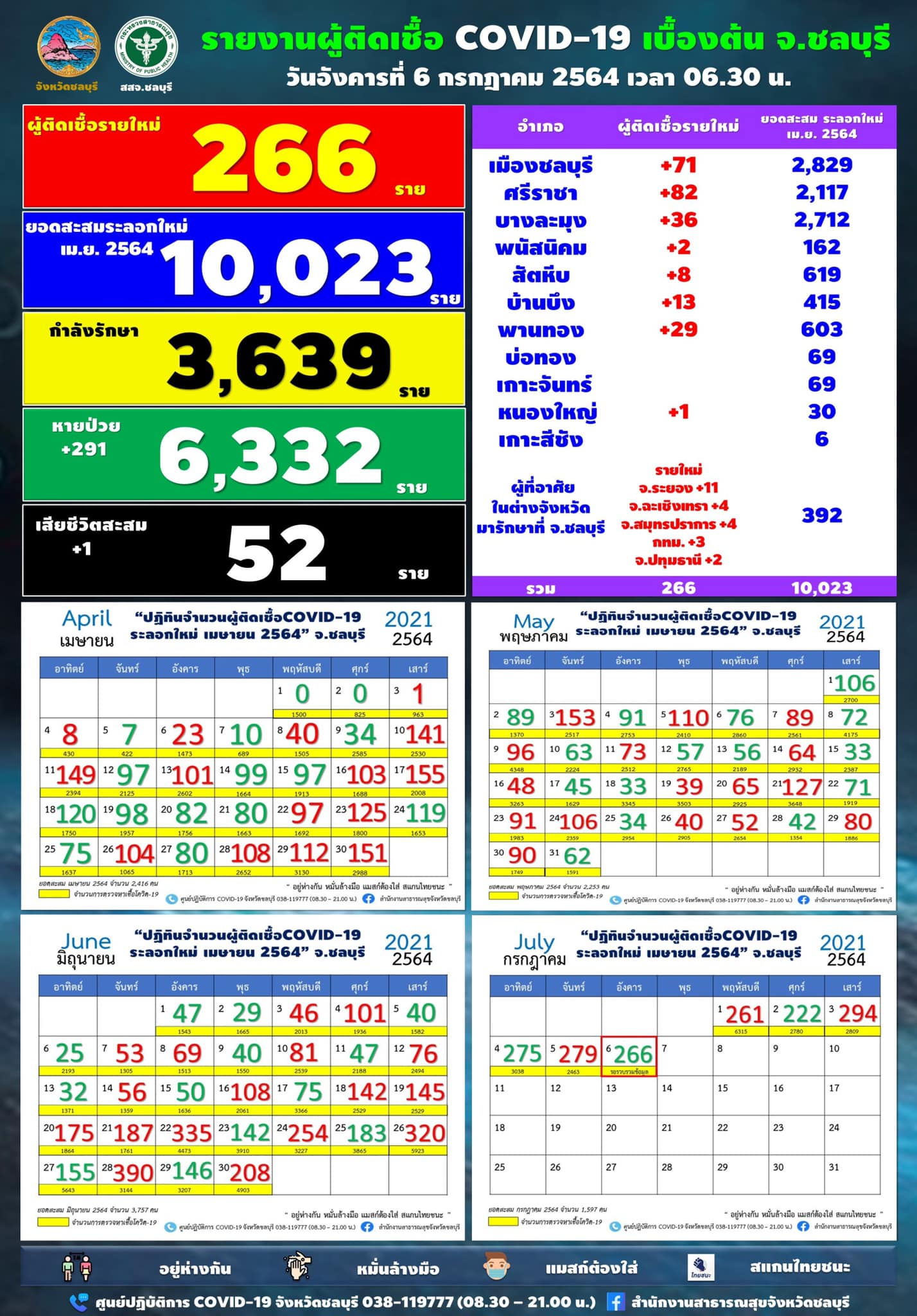 วันที่ 6 กรกฎาคม 2564 สำนักงานสาธารณสุขจังหวัดชลบุรี (สสจ.) ชลบุรี รายงานพบผู้ติดเชื้อโควิด-19 รายใหม่ เพิ่มอีกจำนวน 266 ราย รวมยอดสะสม 10,023 ราย มี อ.เมืองชลบุรี ยอดสะสมเยอะมากที่สุด 2,829 ราย รองลงมาคือ อ.บางละมุง 2,712 ราย