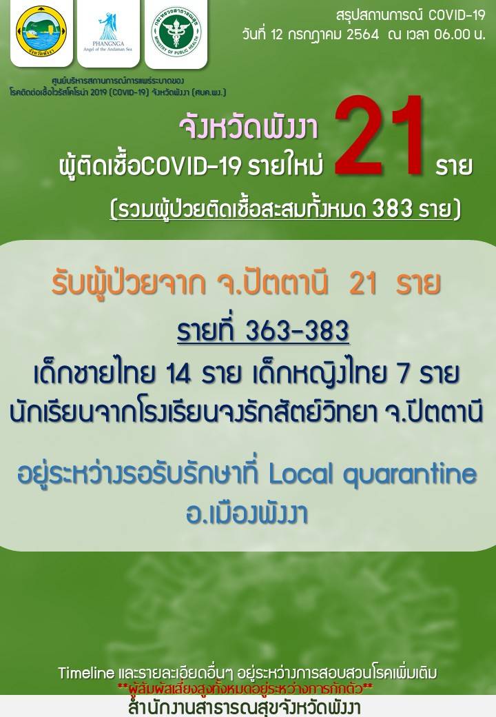 สำหรับโครงการรับลูกหลานชาวพังงากลับบ้าน มีผู้เดินทางกลับมาจากกรุงเทพ 1 ราย ปทุมธานี 4 รายกลุ่มนักเรียนศาสนาเดินทางกลับมาจากโรงเรียนจงรักสัตย์วิทยา จังหวัดปัตตานี 59 ราย พบผู้ป่วยแล้ว 33 ราย มีผู้ป่วยสะสมตั้งแต่วันที่ 11 เมษายน-วันที่ 11 กรกฎาคม 2564 รวม 383 ราย ผู้ป่วยรักษาหายแล้ว 322 ราย เสียชีวิต 1 ราย กำลังรักษา 48 ราย รับผู้ป่วยจากต่างจังหวัด 33 ราย ในพื้นที่ไม่พบผู้ป่วยรายใหม่ 3 วันต่อเนื่อง