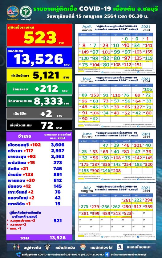 จังหวัดชลบุรีพบผู้ติดเชื้อโควิด-19 เพิ่ม 523 ค้นหาผู้สัมผัสทั้งหมด 903 ขณะค้นหาเชิงรุกเบื้องต้นกว่าพันคน