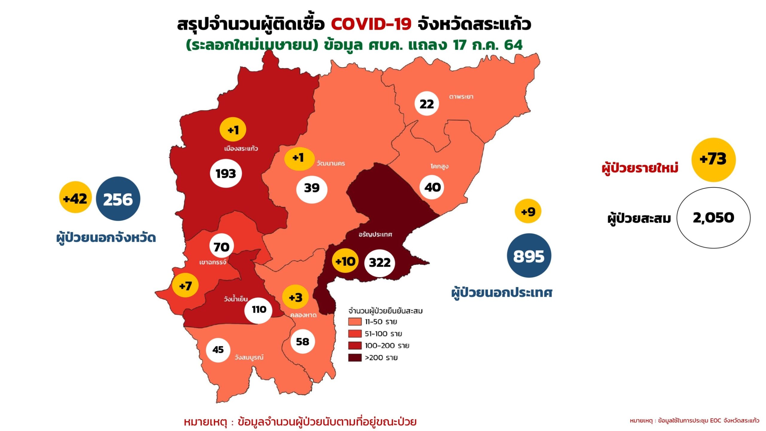 นพ.ประภาส ผูกดวง นายแพทย์สาธารณสุขจังหวัดสระแก้ว เปิดเผยว่า วันนี้(17 กรกฎาคม 64)จังหวัดสระแก้ว พบผู้ป่วยยืนยันรายใหม่ 64 ราย(ติดเชื้อในจังหวัด 22 ราย นอกจังหวัด 42 ราย) ติดเชื้อจากต่างประเทศ 9 ราย รวมทั้งสิ้น73ราย มาจากการตรวจเชิงรุกในชุมชนและมาตรการเฝ้าระวังในกลุ่มผู้สัมผัสเสี่ยงสูงใน LQ คนไทยข้ามแดน และในกลุ่มคนสระแก้วที่กลับมารักษาที่บ้าน สำหรับผู้ติดเชื้อในจังหวัด 22 รายที่ อำเภออรัญประเทศ 10 ราย อำเภอเขาฉกรรจ์ 7 ราย อำเภอคลองหาด 3 ราย อำเภอเมืองสระแก้ว และอำเภอวัฒนานคร อำเภอละ 1 ราย