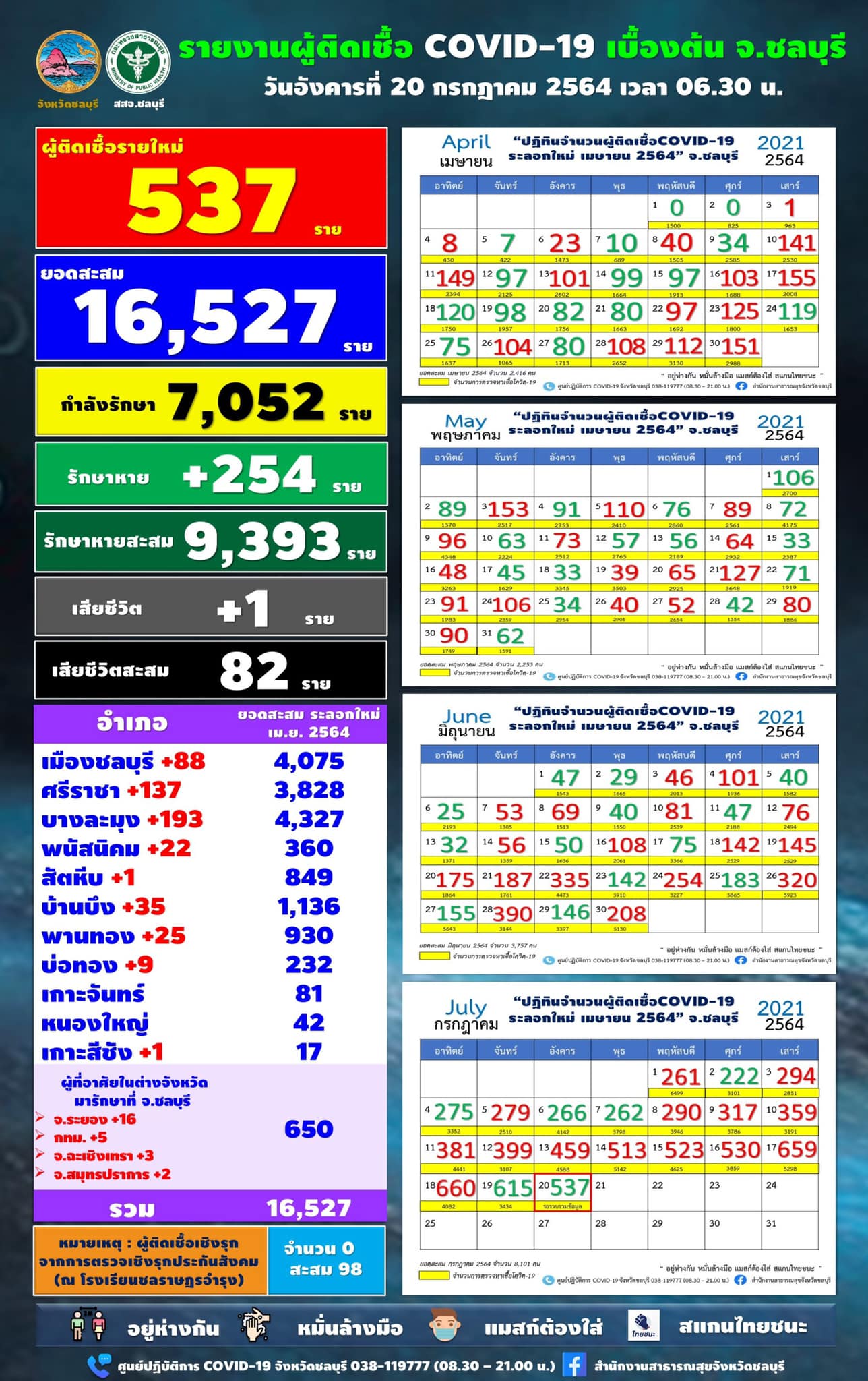 วันที่ 20 กรกฎาคม 2564 สำนักงานสาธารณสุขจังหวัด ชลบุรี (สสจ.) ชลบุรี รายงานพบผู้ติดเชื้อโควิด-19 รายใหม่ เพิ่มอีกจำนวน 537 ราย รวมยอดสะสม  16,527 ราย มี อ.บางละมุง ยอดสะสมเยอะมากที่สุด 4,327 ราย รองลงมาคือ อ.เมืองชลบุรี 4,075  ราย