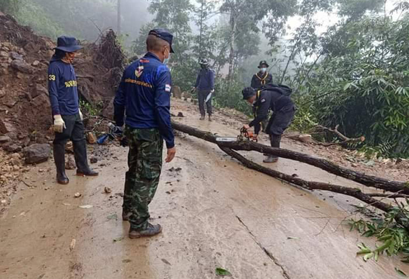 ชายแดนไทย-เมียนมา จังหวัดตาก ได้เกิดพายุฝนตกหนัก เหตุ ดินสไลด์ ต้นไม้ใหญ่ล้ม ปิดเส้นทางจราจร บน ถนนโครงการหลวงเลอตอ – ถนน พังเสียหายหลายแห่ง นายเลิศศักดิ์ ทับผึ้ง นายอำเภอแม่ระมาด จังหวัดตาก ได้ประสานไปยัง พ.อ. ยศศักดิ์ บรรเทา ผู้บัญชาการหน่วยพัฒนาการเคลื่อนที่ 33 (ผบ.นพค.33) ศูนย์บัญชาการทหารพัฒนา 3 กองบัญชาการกองทัพไทย ได้รับแจ้ง จึง สั่งการให้นำ เครื่องจักร อุปกรณ์ รถไถ รถตัก และจัดกำลังพลชุดบรรเทาสาธารณภัยเคลื่อนที่เร็วของหน่วย นพค.33 พร้อมเครื่องจักรกล ร่วมกับ ชุดปฏิบัติการหน่วยเฉพาะกิจกรมทหารพรานที่ 35 (ชป.ฉก.ทพ.35 ) และเครือข่ายนักพัฒนาในพื้นที่ เข้าดำเนินการช่วยเหลือเหตุดินสไลด์ ทับถมปิดเส้นทางจราจร จำนวน 2 จุด เนื่องจากพายุฝนตกหนักต่อเนื่อง มีดินสไลด์จากภูเขาลงมาทับเส้นทาง และพื้นผิวถนนเสียหาย การคมนาคม รถยนต์ไม่สามารถสัญจรผ่าน ไป มา ได้ ทหาร จึงได้ทำการเร่งเคลียร์เส้นทาง ขนย้ายดินโคลน และกำจัดเศษวัสดุ กิ่งไม้ ให้พ้นผิวการจราจร