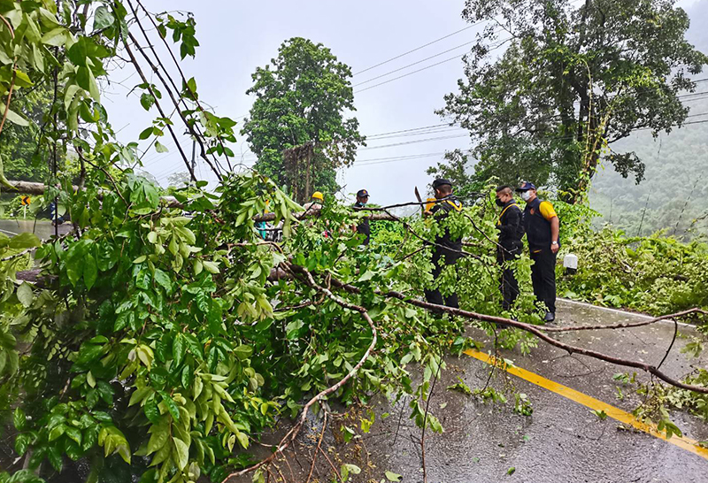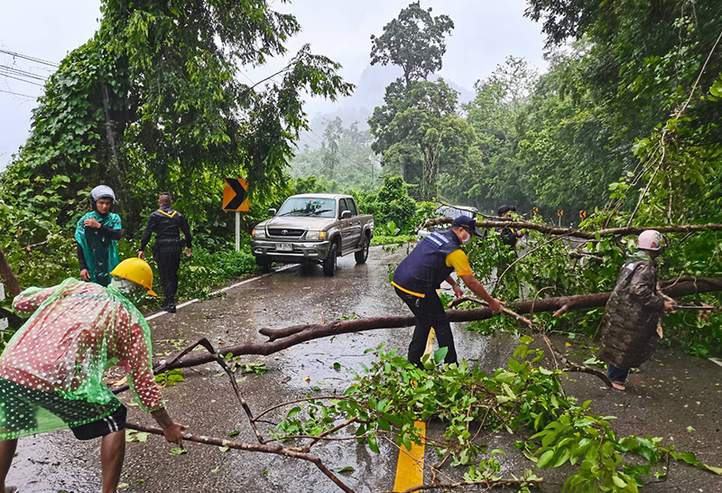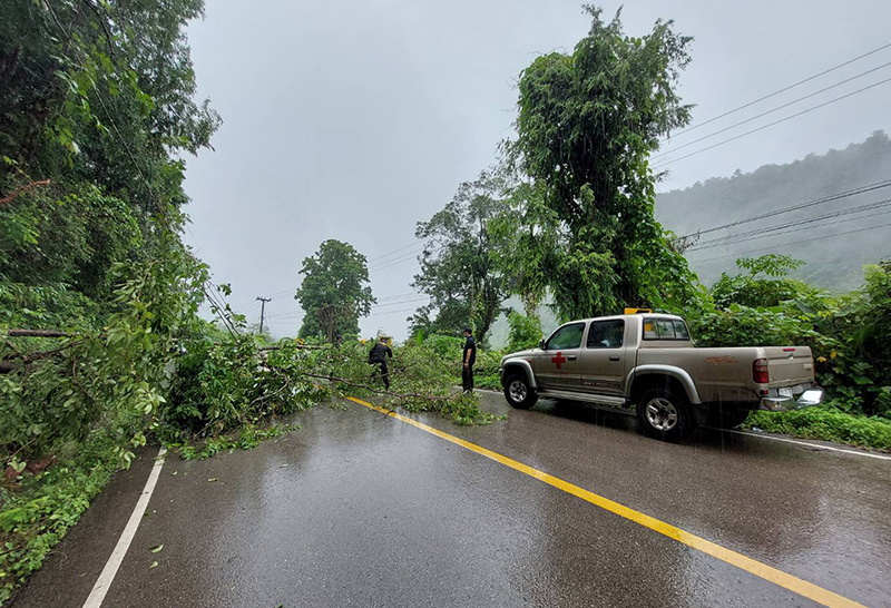 ตากฝนตกหนักดินสไลด์ต้นไม้ใหญ่ล้มขวางถนน