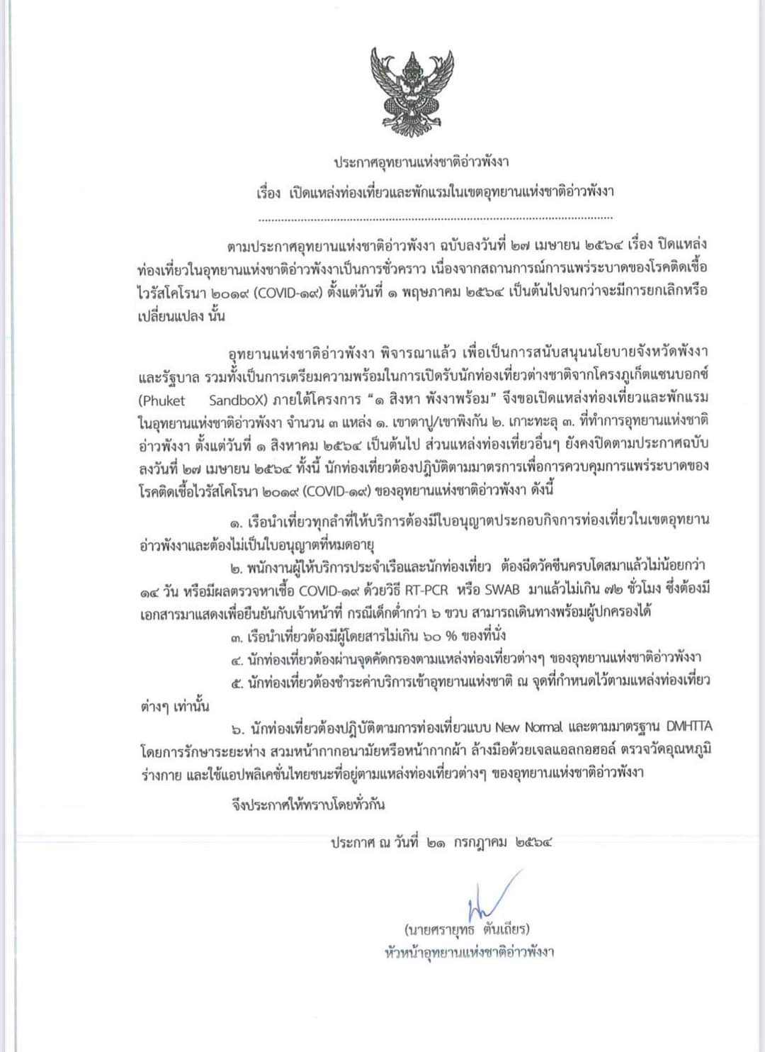 ผู้สื่อข่าวรายงานว่า ทางอุทยานแห่งชาติอ่าวพังงา โดยนายศรายุทธ ตันเถียร หัวหน้าอุทยานแห่งชาติอ่าวพังงา ได้ออกประกาศลงวันที่ 21 ก.ค.64 เรื่อง เปิดแหล่งท่องเที่ยวพักแรมในเขตอุทยานแห่งชาติอ่าวพังงา หลังจากได้ประกาศปิดแหล่งท่องเที่ยวชั่วคราวภายในอุทยานแห่งชาติอ่าวพังงา ตั้งแต่วันที่ 1 พ.ค.64 เนื่องจากสถานการณ์โควิดแพร่ระบาด โดยทางอุทยานแห่งชาติอ่าวพังงา ได้สนับสนุนนโยบายจังหวัดพังงาและรัฐบาล ในการเปิดรับนักท่องเที่ยวต่างชาติจากโครงการ ภูเก็ตแซนด์บ็อกซ์ ภายใต้โครงการ 1 สิงหาคม พังงาพร้อม จึงขอเปิดแหล่งท่องเที่ยวและพักแรมในอุทยานแห่งชาติอ่าวพังงา จำนวน 3 แหล่ง คือ เขาตาปู-เขาพิงกัน เกาะทะลุ และ ที่ทำการอุทยานแห่งชาติอ่าวพังงา ตั้งแต่วันที่ 1 สิงหาคม 64 เป็นต้นไป