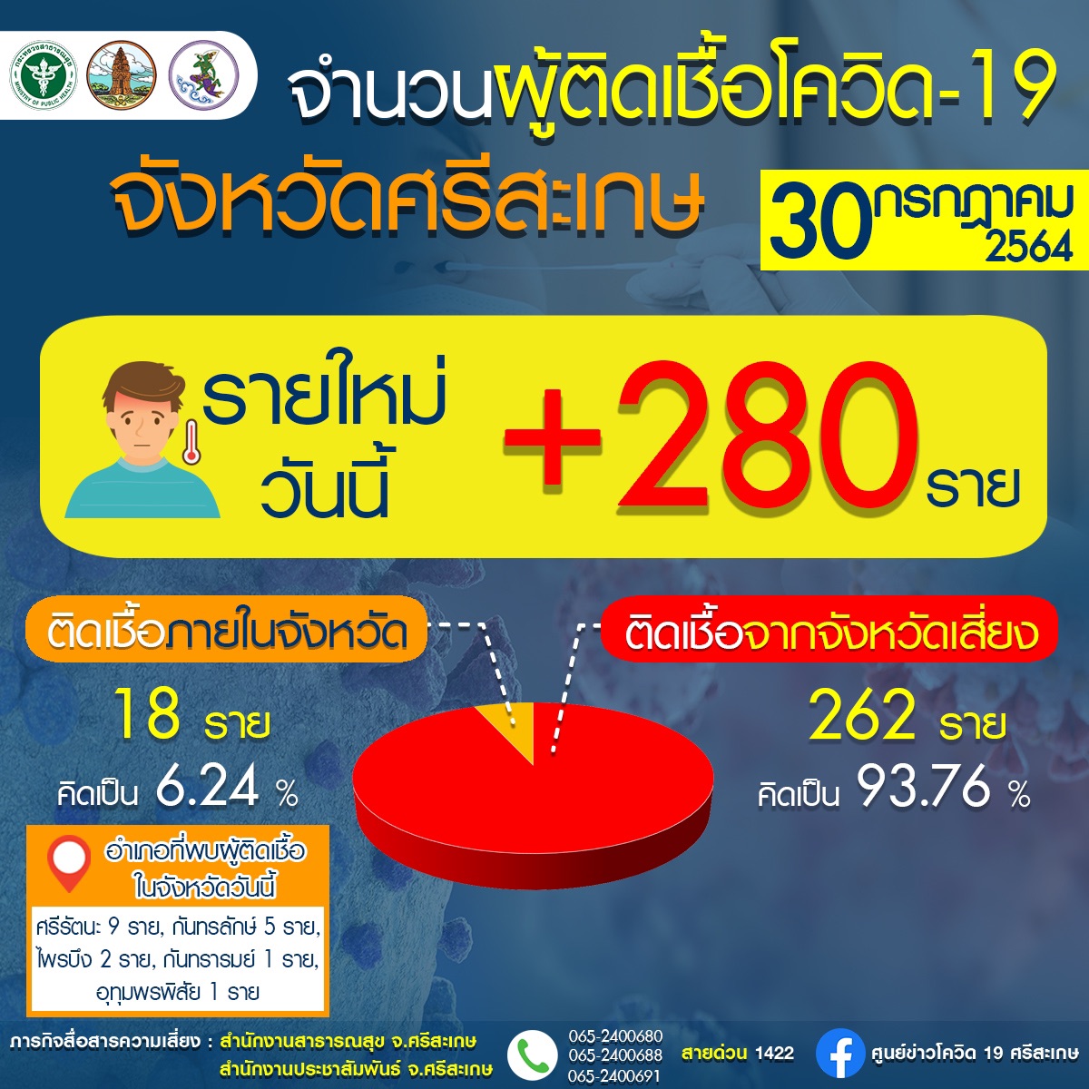 ขณะเดียวกัน ศูนย์ปฏิบัติการตอบโต้ภาวะฉุกเฉินกรณีโรคติดเชื้อไวรัสโควิด-19 จ.ศรีสะเกษ ได้เปิดเผยข้อมูลผู้ป่วยติดเชื้อโควิด-19 ประจำวันที่ 30 ก.ค.64 ว่า ในวันนี้มีผู้ติดเชื้อเพิ่ม จำนวน 280 ราย ยอดสะสมภายในจังหวัด จำนวน 3,765 ราย รักษาหายวันนี้ จำนวน 197 ราย รักษาหายสะสม จำนวน 2,065 ราย รักษาอยู่ จำนวน 1,684 ราย อ.ศรีรัตนะ ยอดพุ่งทะลุสูงถึง 482 ราย มีผู้ติดเชื้อสูงสุดของ จ.ศรีสะเกษ รองลงมาคือ อ.กันทรลักษ์ 401 ราย อ.เมืองศรีสะเกษ 229 ราย โดยผู้ที่เดินทางมาจากพื้นที่เสี่ยงจังหวัดอื่นตรวจพบเชื้อที่จ.ศรีสะเกษ จำนวน 238 ราย สะสม 2,741 ราย ผู้ป่วยติดเชื้อภายในจังหวัดเพิ่มวันนี้ 18 ราย สะสม 577 ราย ผู้ป่วยที่ตรวจพบเชื้อในจังหวัดอื่นมารักษาที่ จ.ศรีสะเกษ เพิ่มวันนี้ จำนวน 24 ราย สะสม 447 ราย
