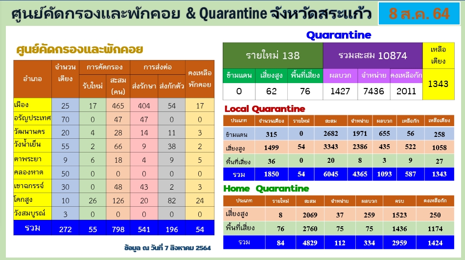นพ.ประภาส ผูกดวง นายแพทย์สาธารณสุขจังหวัดสระแก้ว เปิดเผยว่า วันนี้ (8 สิงหาคม 64) มีจำนวนผู้ป่วยยืนยัน 265 ราย แยกเป็นติดเชื้อในจังหวัด 212 รายและจากจังหวัดอื่น 53 ราย มีผู้เสียชีวิต 2 รายเป็นรายที่ 26 และ 27 ของจังหวัดสระแก้ว ผู้ป่วยทั้งหมดมาจากระบบเฝ้าระวังในโรงพยาบาล การตรวจเชิงรุกในชุมชน มาตรการเฝ้าระวังในกลุ่มผู้สัมผัสเสี่ยงสูงใน LQ และคนสระแก้วที่กลับมารักษาที่บ้าน ผู้ติดเชื้อในจังหวัด 212 รายที่ อำเภออรัญประเทศ 170 ราย อำเภอตาพระยา 15 ราย อำเภอวังน้ำเย็น 8 ราย อำเภอเมืองสระแก้ว 7 ราย อำเภอวัฒนานคร 4 ราย อำเภอเขาฉกรรจ์ 4 ราย อำเภอวังสมบูรณ์ 3 ราย และอำเภอโคกสูง 1 ราย ทำให้การระบาดระลอกเมษายน (ตั้งแต่วันที่ 4 เมษายนถึง 7 สิงหาคม 2564) จังหวัดสระแก้วมีผู้ป่วยยืนยันสะสม 5,336 ราย แยกเป็นติดเชื้อในจังหวัดและติดเชื้อจากจังหวัดอื่น 4,409 ราย ติดเชื้อจากต่างประเทศ 927 ราย ผู้ต้องขังใหม่ 5 ราย รักษาหาย 3,335 ราย กำลังรักษาตัวอยู่ 2,343 ราย เสียชีวิตสะสม 27 ราย