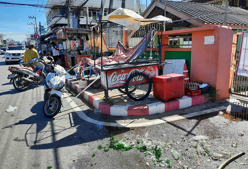 แต่ของน้องรถโจ๊กเขาเก็บเรียบร้อยแล้วเสี้ยววินาทีเดียวรถของน้องก็ตีลังกาตกลงไปข้างฟุตบาทน้องเขาก็เลยหมอบเพราะว่าลมมันแรงเสี้ยววินาทีเดียวก็ตั้งสติแต่ไม่ได้เสียสติคือตกใจอยู่ ก็เอามือไปหมุนปิดแก๊สเปิดแรงไว้ด้วยกลัวมันจะตีแล้วมันจะระเบิด วินาทีนั้นคิดว่าตายแน่ๆเราไม่เคยเจอวิกฤตแบบนี้ตกใจมากแต่มีสติรีบไปปิดแก็ส คิดว่าถ้ารถมันตีลังกาแก็สต้องระเบิดแน่ค่าเสียหายประเมินรวมประมาณ 9000 บาท แต่ตอนนี้เอารถไปให้ช่างเขาซ่อมแล้ว ซึ่งก็ได้รับการประสานจากตำรวจแล้วว่าจะมาดูแลความเสียหายและชดใช้ให้