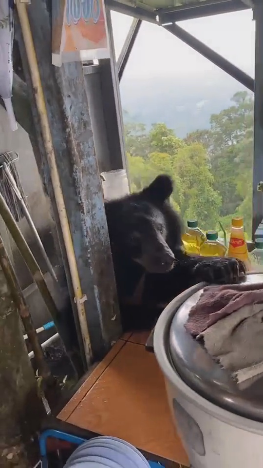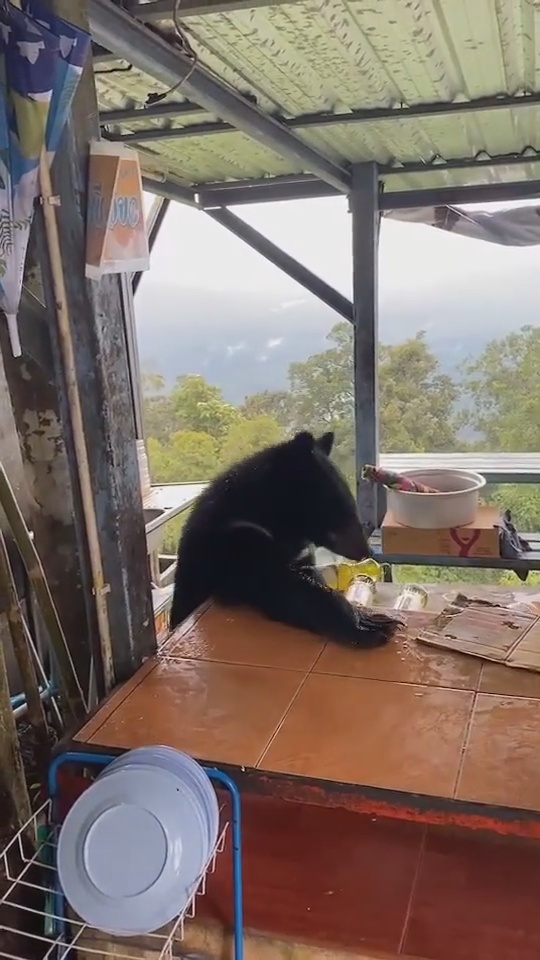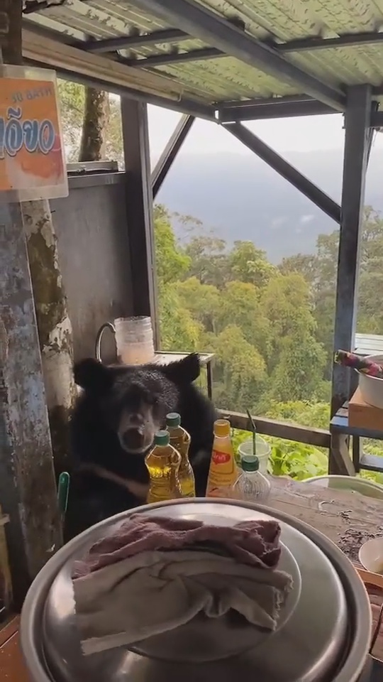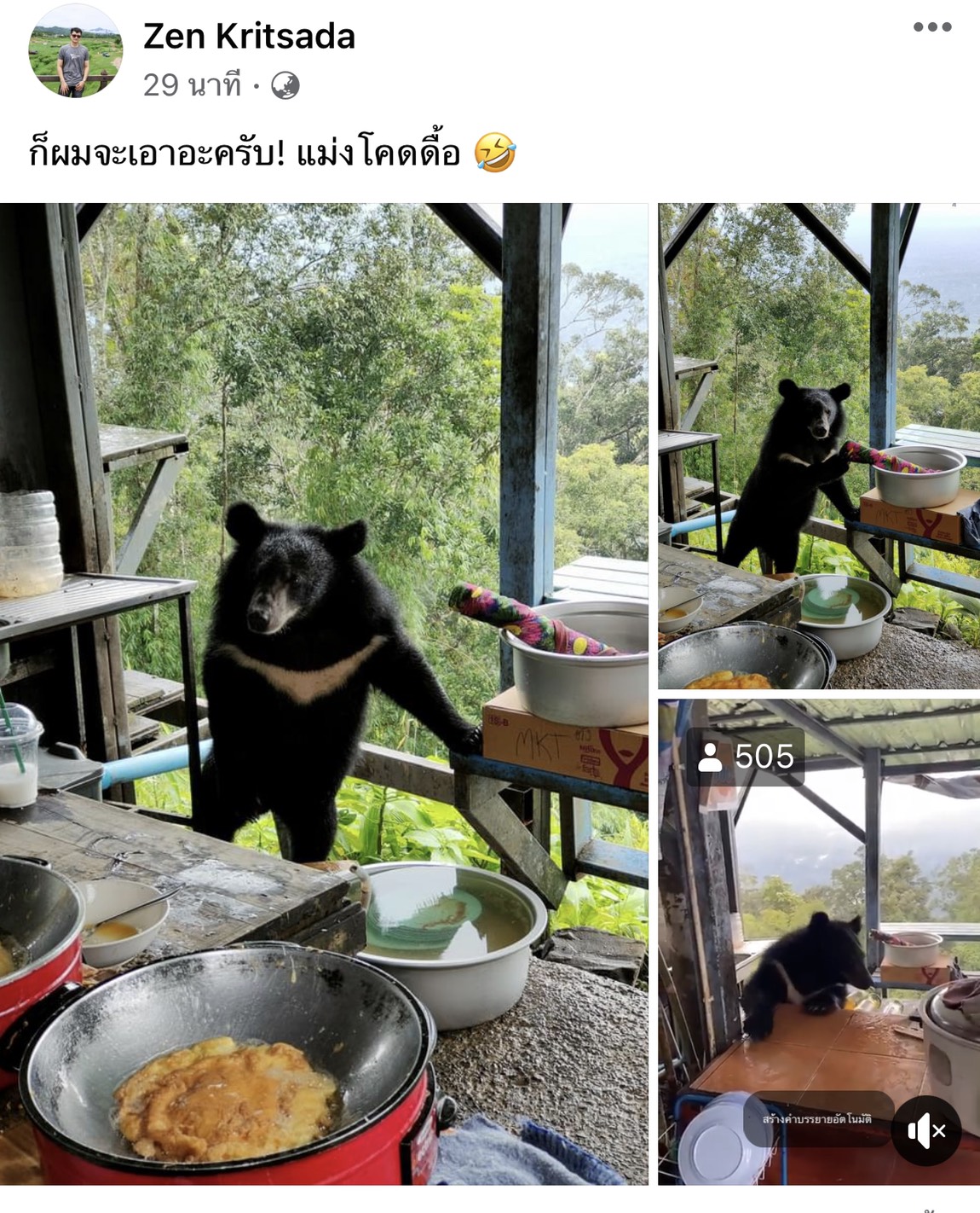 นครราชสีมา-โดยมีผู้ใช้เฟซบุ๊ก ชื่อ Zen Kritsada ได้โพสต์ภาพลงในกลุ่มเพจอุทยานแห่งชาติเขาใหญ่ พร้อมข้อความ “ก็ผมจะเอาอะครับ! แม่งโคดดื้อ” ซึ่งหลังจากโพสต์ไปไม่กี่นาที ก็มีผู้เข้ามาแสดงความคิดเห็นกันเป็นจำนวนมาก โดยภาพที่ปรากฏในคลิป เป็นภาพของหมีควายวัยรุ่นตัวหนึ่ง ใช้ความพยายามปีนต้นไม้ขึ้นมาบนร้านจำหน่ายอาหาร บริเวณจุดชมทิวทัศน์เขาเขียว ในอุทยานแห่งชาติเขาใหญ่ ต.หมูสี อ.ปากช่อง จ.นครราชสีมา ใกล้กับที่ทำการเรดาร์ของกองทัพอากาศ ขณะแม่ค้ากำลังเจียวไข่หอมฟุ้งอยู่ภายในร้าน ซึ่งหมีควายตัวดังกล่าวเดินดิ่ง 2 ขา มาที่โต๊ะทำกับข้าว พยายามหาทุกอย่างที่กินได้ จนแม่ค้าตกใจ ต้องรีบขยับหนีทั้งๆที่ไข่เจียวเสร็จแล้ว แต่ไม่สามารถตักใส่จานได้ทัน