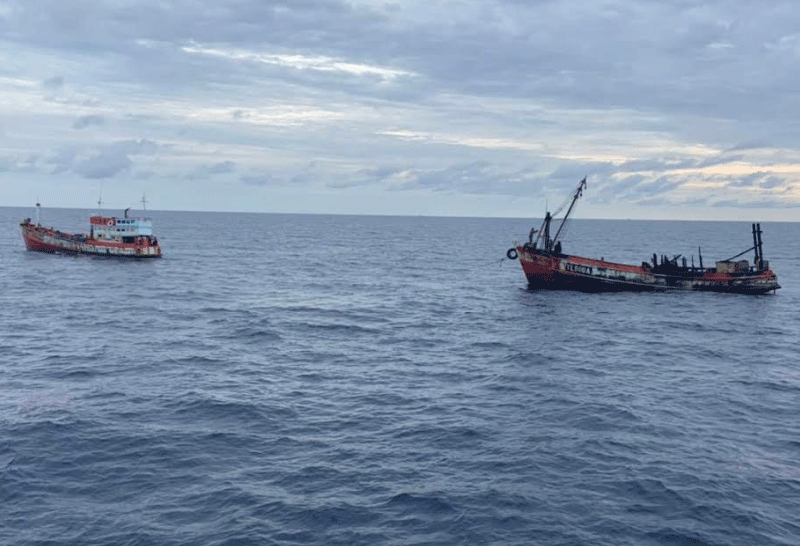 เจ้าหน้าที่ช่วยลูกเรือ 12 ชีวิต จากเรือไฟไหม้ ขณะเติมน้ำมันกลางทะเล พบว่าลูกเรือทั้งหมดปลอดภัย