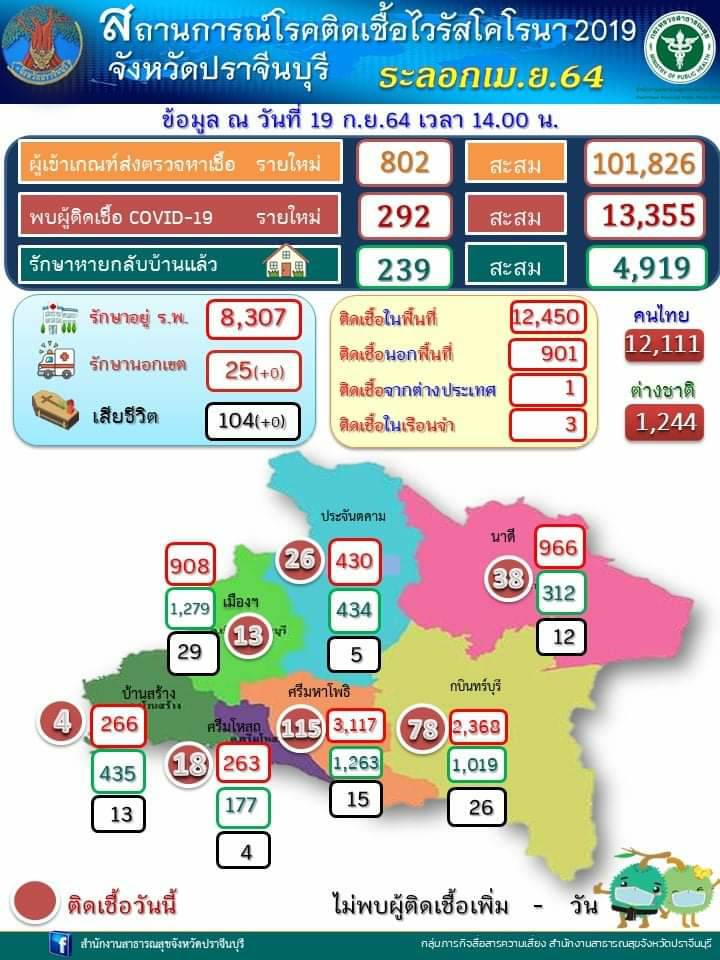 จังหวัดปราจีนบุรีขอแจ้งสถานการณ์การแพร่ระบาดของโรคติดเชื้อไวรัสโคโรนา 2019 ณ วันที่ 19 กันยายน 2564 พบผู้ติดเชื้อไวรัสโคโรนา 2019 รายใหม่ จำนวน 292 ราย เป็นผู้ป่วยสะสมในพื้นที่ 12,450 ราย ติดเชื้อนอกพื้นที่เข้ามารักษา 901 ราย ติดเชื้อจากต่างประเทศ1 รายติดเชื้อในเรือนจำ 3 ราย เสียชีวิตสะสม 104ราย ทำให้จังหวัดปราจีนบุรี มีผู้ป่วยสะสม (ระลอกเมษายน 2564) ตั้งแต่วันที่ 1 เมษายน ถึง 19 กันยายน 2564 จำนวน 13.355 ราย ได้เข้ารับการรักษาในโรงพยาบาลทุกราย ผู้สัมผัสใกล้ชิดเสี่ยงสูงได้ติดตามตรวจหาเชื้อแล้ว