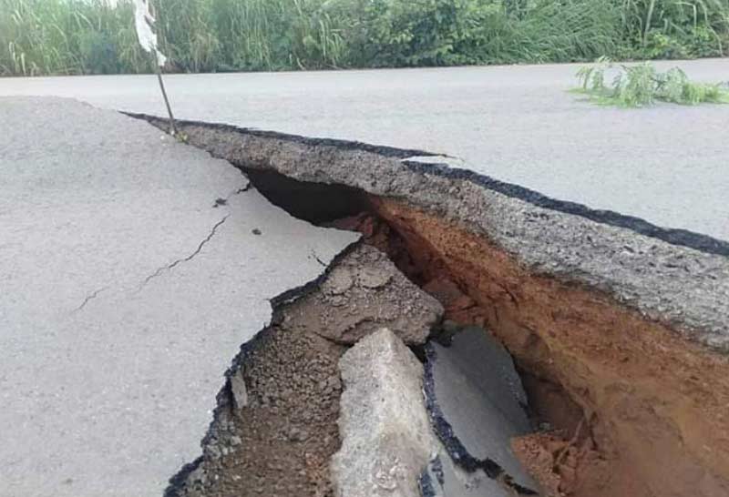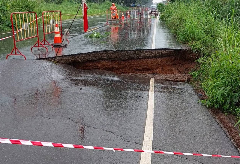 หวิดดับ ! ฝนตกหนักต่อเนื่อง ทำถนนทรุดเกิดรอยแยกขนาดใหญ่ จยย.พลิกคว่ำ เจ็บสาหัส 2 ราย กู้ภัยเร่งช่วยเหลือ