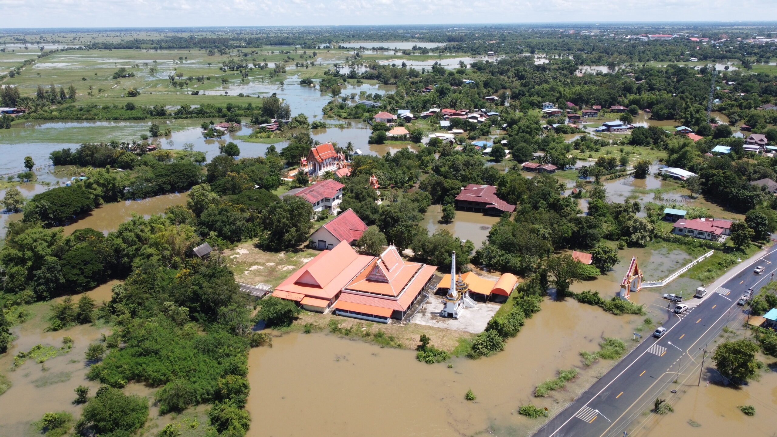 มุมสูงน้ำอ่างลำเชียงไกรไหลทะลักท่วมหมู่บ้านอื้อ