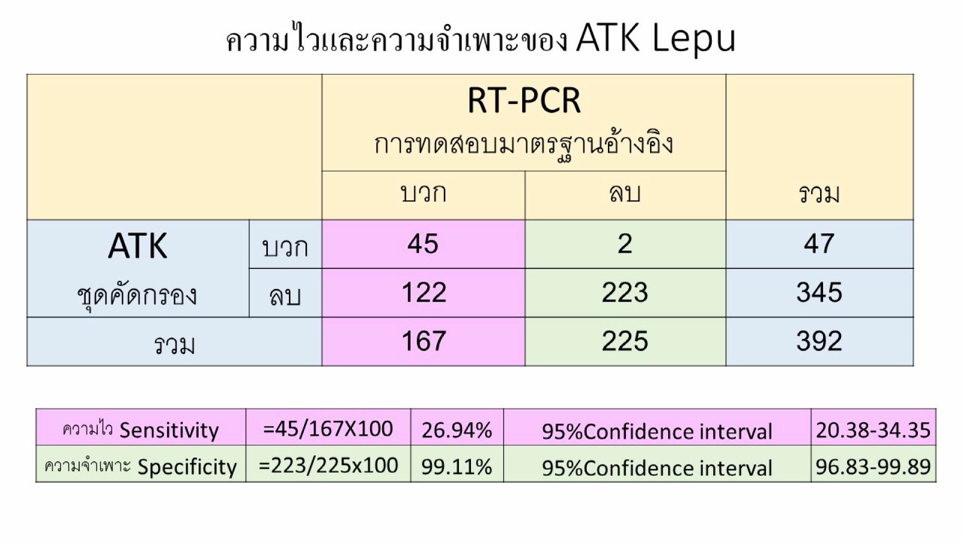 “ข้อเท็จจริงในการศึกษาจำนวนนี้มีผลที่น่าตกใจ กล่าวคือจากการศึกษาวิจัยเปรียบเทียบผล ATK กับ ผลRT-PCR ในบุคคลเดียวกัน โดยเลือกผู้ที่อยู่ในกลุ่มเสี่ยงสูงต่อการติดเชื้อโควิด (High risk contact) ในอำเภอเมือง จังหวัดนครศรีธรรมราช จำนวน 392 คน พบว่า มีผลลบลวงในกลุ่มผู้ที่ติดเชื้อโควิดจริงเท่ากับ 73% (กล่าวคือATK ให้ผลเป็นลบจำนวน 122 คน จากจำนวนผู้ติดเชื้อจริงที่มีผล RT-PCRเป็นบวกจำนวน 167 คน) ทำให้สามารถคำนวณค่าความไว (Sensitivity)ได้เท่ากับ 27% (คำนวณจาก ผลATK เป็นบวกจำนวน 45 คนจากการตรวจในผู้ติดเชื้อโควิดจริงที่มีผล RT-PCR เป็นบวกจำนวน 167 คน) ซึ่งโดยปกติแล้ว ค่าความไวของชุดคัดกรองที่ดีจะต้องสูงถึง 70-90% ขึ้นไปจึงจะมีประโยชน์ในการคัดกรองได้ ส่วนที่สำคัญคือผู้ป่วยที่มีผลลบลวง ซึ่งเชื่อว่าตนเองไม่มีการติดเชื้อจะสามารถไปแพร่กระจายเชื้อให้กับผู้อื่นได้ง่าย โดยไม่ได้ระมัดระวังตัว ทำให้ไม่สามารถควบคุมการระบาดของโรคได้ นี่คือผลทางวิทยาศาสตร์ที่ออกมาอย่างชัดเจน”