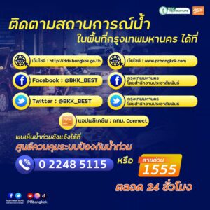 ที่ http://dds.bangkok.go.th/ ,www.prbangkok.com ,Facebook:@BKK_BEST, สำนักงานประชาสัมพันธ์ Twitter:@BKK_BEST, สำนักงานประชาสัมพันธ์และแอปพลิเคชัน กทม. Connect หรือแจ้งปัญหาความเดือดร้อนจากปัญหาน้ำท่วมได้ที่ ศูนย์ควบคุมระบบป้องกันน้ำท่วม โทร.022485115 และสายด่วน 1555 ตลอด 24 ชั่วโมง