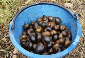 โดยชาวบ้านรายหนึ่งในบ้านตะเภาหนุน ตำบลโนนแดง อำเภอโนนแดง จังหวัดนครราชสีมา เปิดเผยว่า ได้พากันออกมาหาปลาตามทางน้ำไหล และเห็นสิ่งหนึ่งที่มักจะหนีกระแสน้ำท่วมสูงในนาข้าวมาเกาะอยู่ริมฝั่ง ก็คือ หอยนา หอยขม และหอยเชอรี่ ซึ่งตามปกติหอยเหล่านี้ ชาวนามักจะใช้ยากำจัด เพราะถือเป็นศัตรูพืชที่กัดกินต้นข้าว ถ้าปล่อยไว้หอยเหล่านี้จะแพร่พันธุ์ได้เร็วมาก ส่วนการนำหอยเหล่านี้มารับประทาน จึงมักจะเป็นในช่วงฤดูน้ำหลาก เพราะหอยจะหนีน้ำท่วมสูง ออกจากท้องนา ชาวบ้านจึงสามารถจับมาประกอบอาหารได้