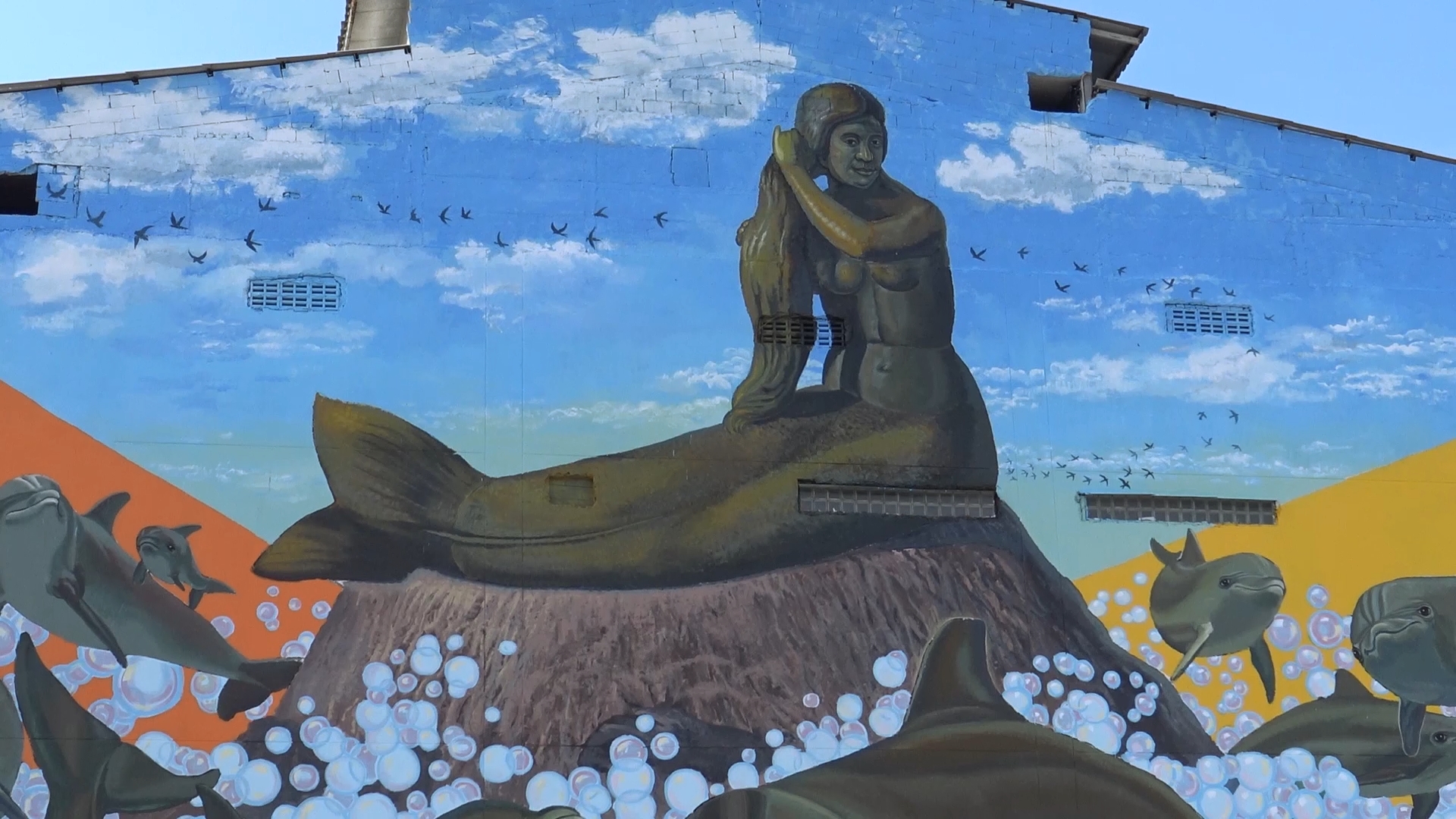 ภาพ Street Art ขนาดใหญ่ที่สุดในประเทศไทย ภาพนางเงือกสัญลักษณ์การท่องเที่ยวของจ.สงขลาและฝูงปลาโลมาแหวกว่ายในทะเล
