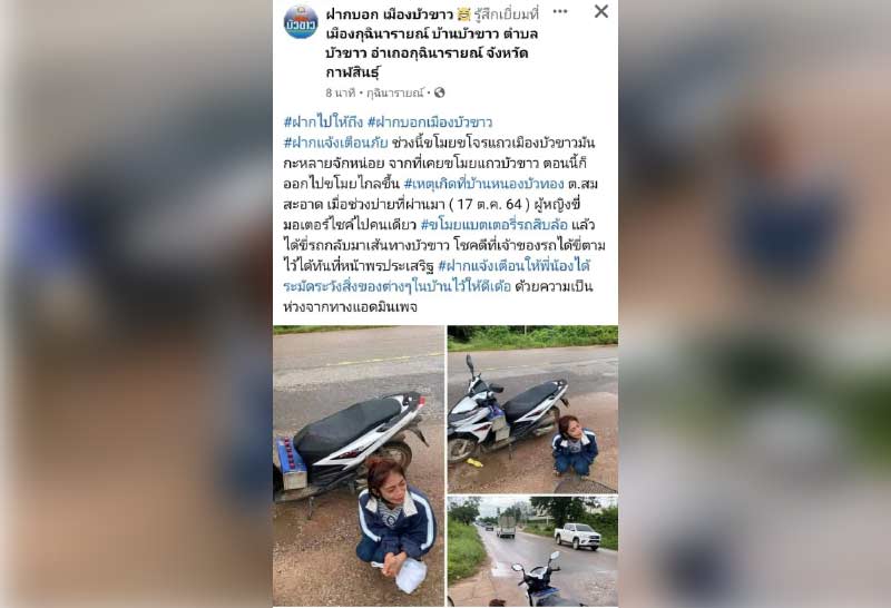 ผู้สื่อข่าวรายงานว่า เพจฝากบอกเมืองบัวขาว ได้โพสต์ภาพและข้อความเตือนภัยเหตุการณ์หญิงสาวขโมยแบตเตอรี่รถยนต์สิบล้อ โดยมีข้อความระบุว่า ฝากไปให้ถึง ฝากบอกเมืองบัวขาว ฝากแจ้งเตือนภัยช่วงนี้ขโมยขโจรแถวเมืองบัวขาวมันกะหลายจักหน่อย จากที่เคยขโมยแถวบ้านบัวขาว ตอนนี้ก็ออกไปขโมยไกลขึ้น เหตุเกิดที่บ้านหนองบัวทอง ต.สมสะอาด เมื่อช่วงบ่ายที่ผ่านมา (17 ต.ค.64) ผู้หญิงขี่มอเตอร์ไซค์ไปคนเดียว ขโมยแบตเตอรี่รถสิบล้อ