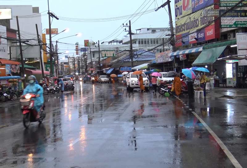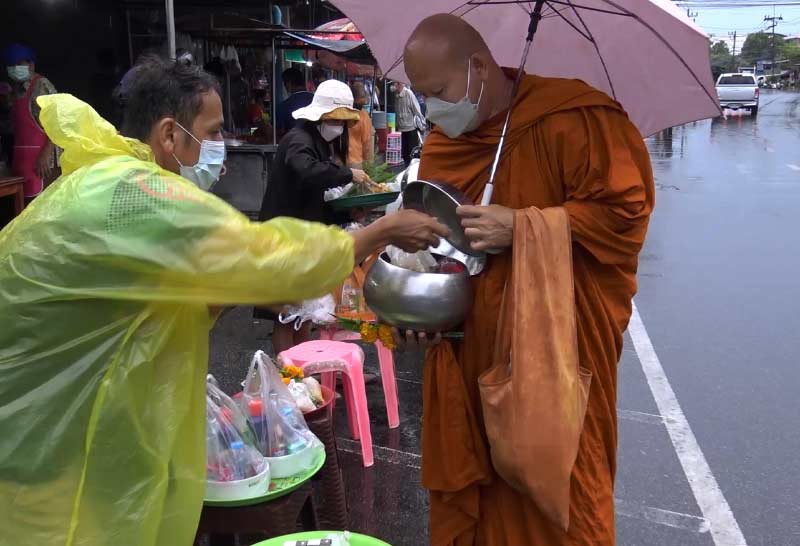 ชาวสงขลาทำบุญตักบาตรพระสงฆ์ในวันออกพรรษา ท่ามกลางสายฝนที่ตกโปรยปรายเพื่อความเป็นสิริมงคลแก่ตนเองและครอบครัว
