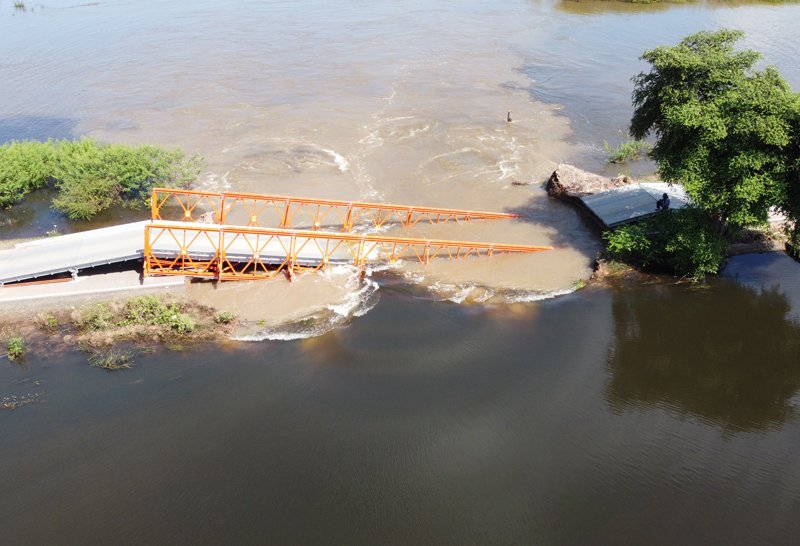 น้ำลำสะแทด เซาะทางยาวกว่า 20 เมตร สะพานเบลีย์ขาด ชาวบ้านเดือดร้อนซ้ำ ปภ.เร่งแก้ไข ยกและต่อความยาวสะพาน