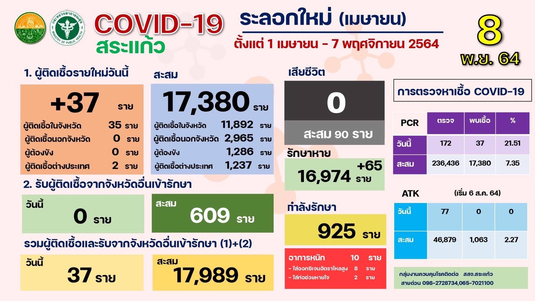 จังหวัดสระแก้ว วันที่ 9 พฤศจิกายน 2564พบผู้ติดเชื้อรายใหม่ 330 ราย แยกเป็นผู้ติดเชื้อในจังหวัด 327 ราย ติดเชื้อจากจังหวัดอื่น 1 ราย ติดเชื้อจากต่างประเทศ 2 ราย รักษาหาย 72 ราย กำลังรักษา 1,182 ราย อาการหนัก 10 ราย เสียชีวิต 1 รายเป็นรายที่ 91 ของจังหวัดสระแก้ว ผู้ติดเชื้อในจังหวัดจำแนกตามอำเภอ ที่ อ.อรัญประเทศ 268 ราย(คลัสเตอร์ใหม่ค่ายวิวัฒน์พลเมือง 266 ราย) อ.เมืองสระแก้ว 19 ราย อ.วัฒนานคร 19 ราย อ.คลองหาด14 ราย อ.วังน้ำเย็น 5 ราย อ.เขาฉกรรจ์ 1 ราย และอ.ตาพระยา 1 ราย