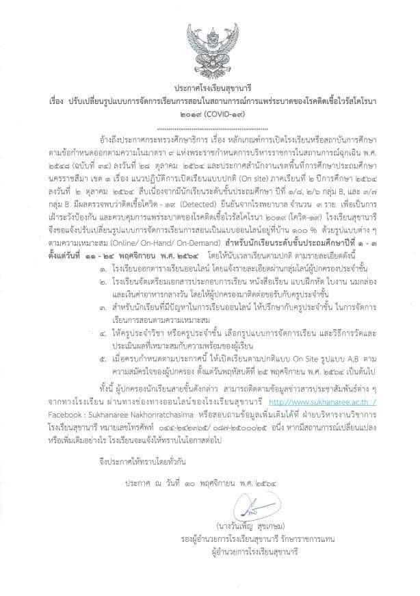 ผู้สื่อข่าวรายงานว่าโรงเรียนสุขานารี ตั้งอยู่ภายในเขตเทศบาลนครนครราชสีมา ได้ออกประกาศแจ้งไปยังผู้ปกครองนักเรียน ปรับเปลี่ยนรูปแบบการเรียนการสอนแบบ On-site ไปเป็นระบบออนไลน์ เนื่องจากมีเด็กนักเรียน 3 ราย ชั้น ป.1/8 , ป.2/6 และ ป.3/7 กลุ่ม B มีผลตรวจยืนยันจากโรงพยาบาลว่า ติดเชื้อไวรัสโควิด-19 หลังจากเพิ่งเปิดเรียนไปเมื่อวันที่ 1 พฤศจิกายนที่ผ่านมา