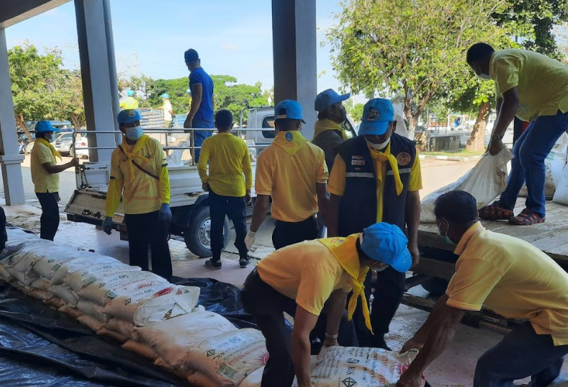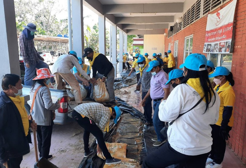 ประชาชนจิตอาสาช่วยกันเก็บกระสอบทรายและเร่งฟื้นฟูทำความสะอาดที่ว่าการอำเภอพิมายหลังน้ำลด